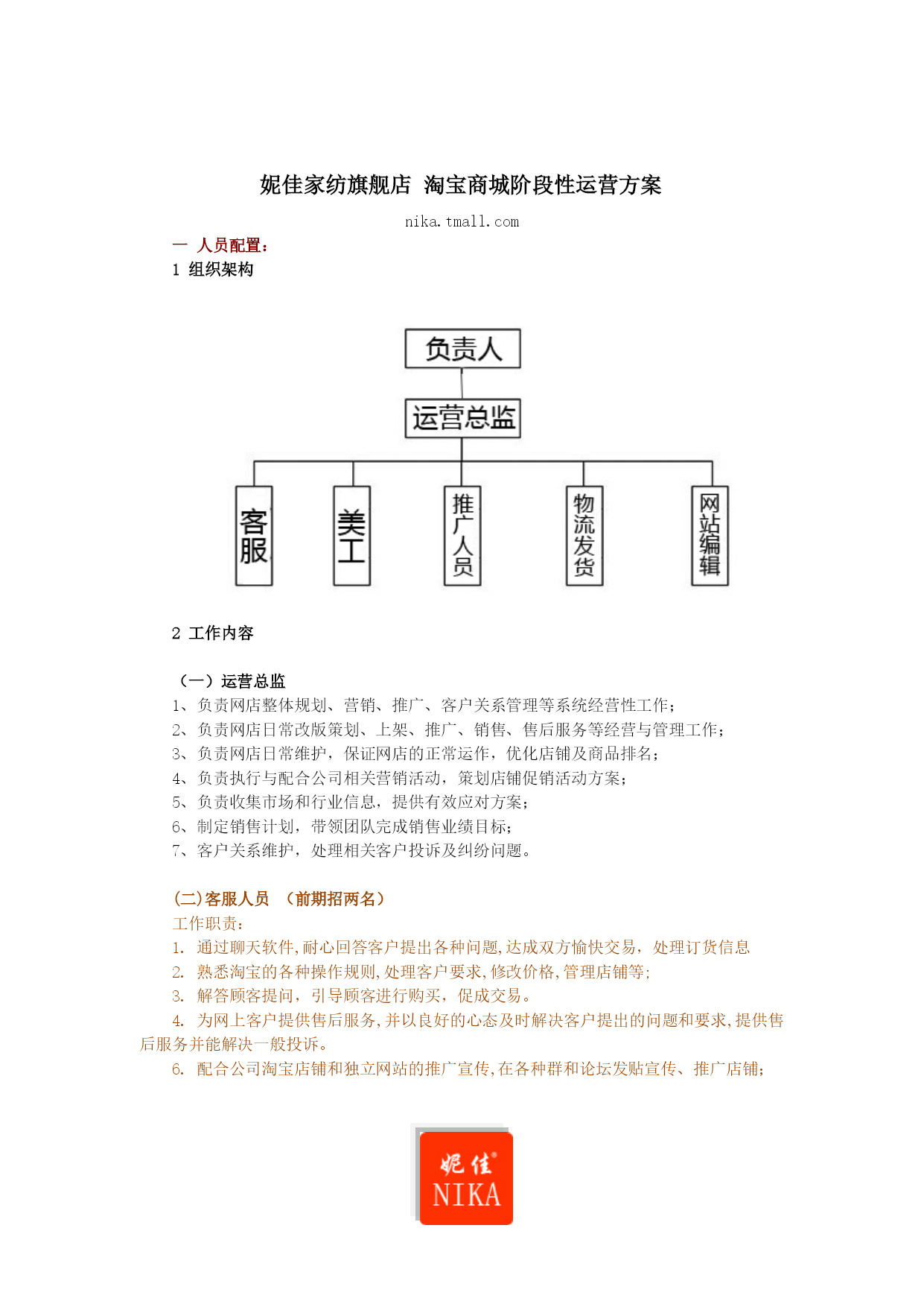 妮佳家纺旗舰店淘宝商城阶段性运营方案nika.tmall.com一人员配置:1组织架构2工作内容(一)运营总监1、负责网店整体规划、营销、推广、客户关系管理等系统经营性工作;2、负责网店日常改版策划、上架、推广、销售、售后服务等经营与管理工作;3、负责网店日常维护,保证网店的正常运作,优化店铺及商品排名;4、负责执行与配合公司相关营销活动,策划店铺促销活动方案;5、负责收集市场和行业信息,提供有效应对方案;6、制定销售计划,带领团队完成销售业绩目标;7、客户关系维护,处理相关客户投诉及纠纷问题。(二)客服