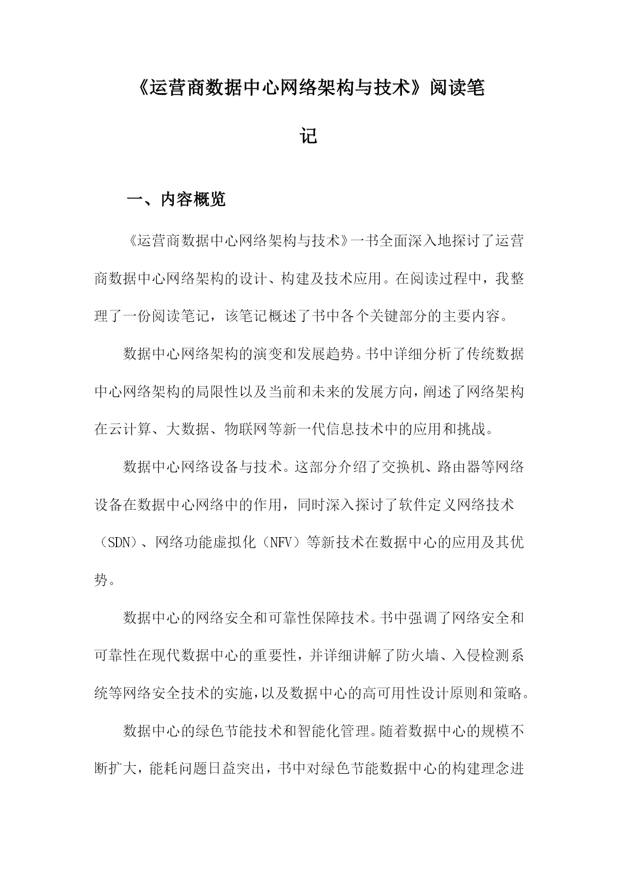 《运营商数据中心网络架构与技术》阅读笔记一、内容概览《运营商数据中心网络架构与技术》一书全面深入地探讨了运营商数据中心网络架构的设计、构建及技术应用。在阅读过程中,我整理了一份阅读笔记,该笔记概述了书中各个关键部分的主要内容。数据中心网络架构的演变和发展趋势。书中详细分析了传统数据中心网络架构的局限性以及当前和未来的发展方向,阐述了网络架构在云计算、大数据、物联网等新一代信息技术中的应用和挑战。数据中心网络设备与技术。这部分介绍了交换机、路由器等网络设备在数据中心网络中的作用,同时深入探讨了软件定义网络技