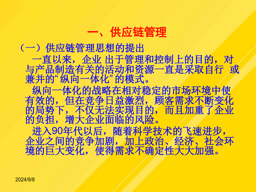 一、供应链管理供应链(又称物流网络)是一个由供应商、仓库、作业、零售渠道等组成的序列。不同的企业的供应链可能因其经营性质、属制造业还是服务业等有所差异。供应链管理的基本思想就是“横向一体化”(HorizontalIntegration),即把原来由企业自己生产的零部件外包出去,充分利用外部资源,于是就跟这些企业成了一种水平关系,形象地称为“横向一体化”。供应链管理是一种集成的管理思想和方法,是对供应链中的物流、信息流、资金流、增值流、业务流以及贸易伙伴关系等进行的计划、组织、协调和控制一体化管理过程。(二