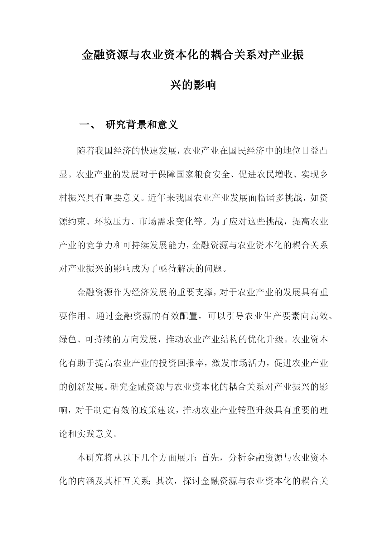 金融资源与农业资本化的耦合关系对产业振兴的影响一、研究背景和意义随着我国经济的快速发展,农业产业在国民经济中的地位日益凸显。农业产业的发展对于保障国家粮食安全、促进农民增收、实现乡村振兴具有重要意义。近年来我国农业产业发展面临诸多挑战,如资源约束、环境压力、市场需求变化等。为了应对这些挑战,提高农业产业的竞争力和可持续发展能力,金融资源与农业资本化的耦合关系对产业振兴的影响成为了亟待解决的问题。金融资源作为经济发展的重要支撑,对于农业产业的发展具有重要作用。通过金融资源的有效配置,可以引导农业生产要素向高