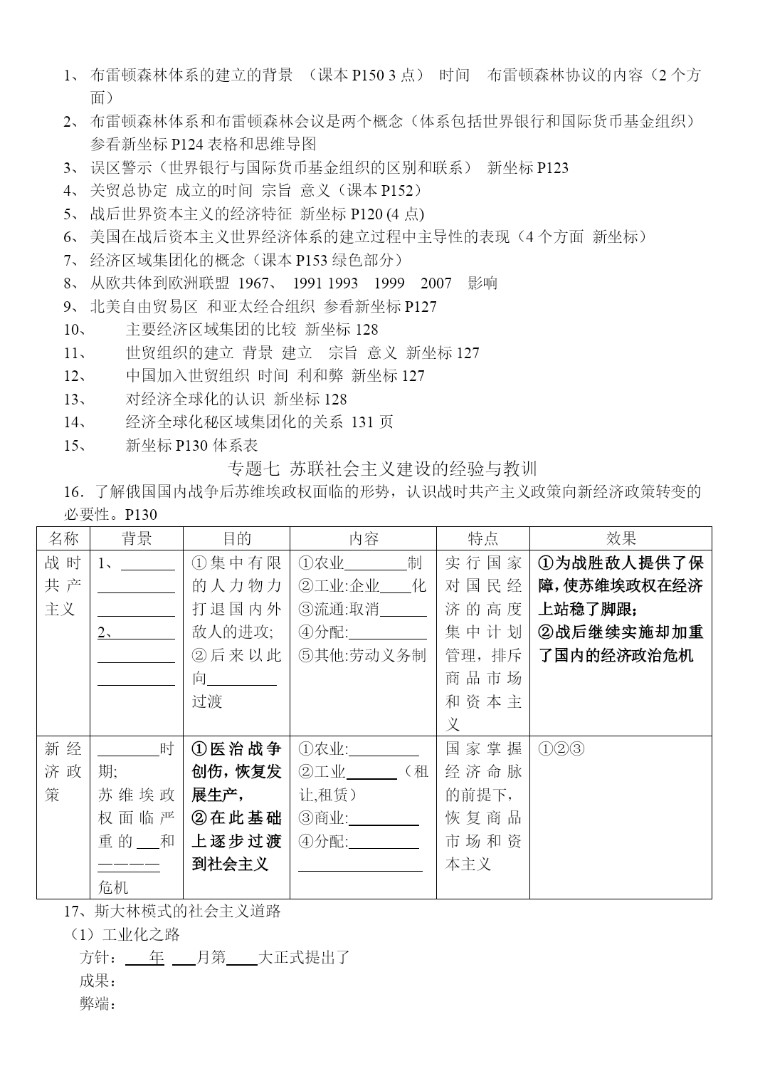 布雷顿森林体系的建立的背景(课本P1503点)时间布雷顿森林协议的内容(2个方面)布雷顿森林体系和布雷顿森林会议是两个概念(体系包括世界银行和国际货币基金组织)参看新坐标P124表格和思维导图误区警示(世界银行与国际货币基金组织的区别和联系)新坐标P123关贸总协定成立的时间宗旨意义(课本P152)战后世界资本主义的经济特征新坐标P120(4点)美国在战后资本主义世界经济体系的建立过程中主导性的表现(4个方面新坐标)经济区域集团化的概念(课本P153绿色部分)从欧共体到欧洲联盟1967、199119931
