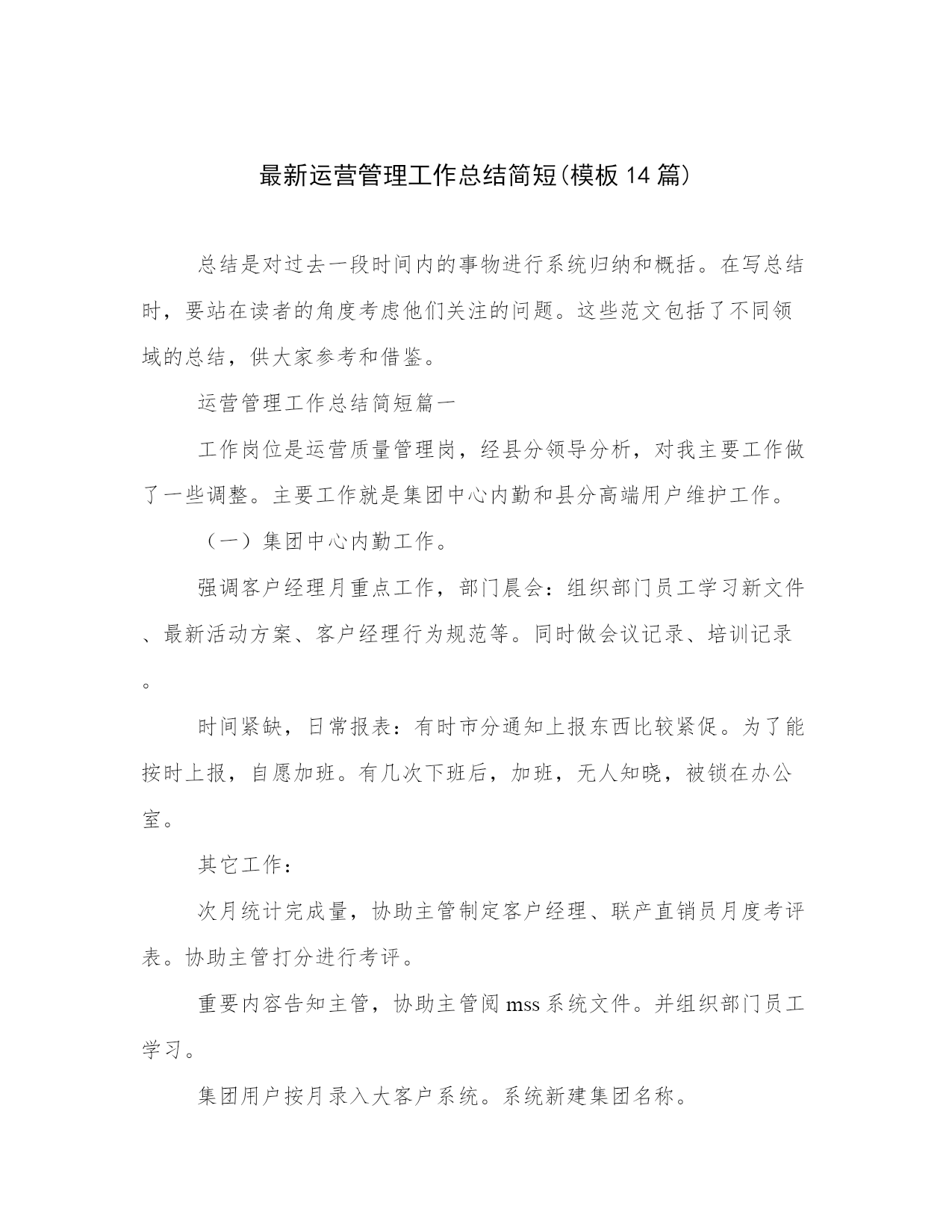 最新运营管理工作总结简短(模板14篇)总结是对过去一段时间内的事物进行系统归纳和概括。在写总结时,要站在读者的角度考虑他们关注的问题。这些范文包括了不同领域的总结,供大家参考和借鉴。运营管理工作总结简短篇一工作岗位是运营质量管理岗,经县分领导分析,对我主要工作做了一些调整。主要工作就是集团中心内勤和县分高端用户维护工作。(一)集团中心内勤工作。强调客户经理月重点工作,部门晨会:组织部门员工学习新文件、最新活动方案、客户经理行为规范等。同时做会议记录、培训记录。时间紧缺,日常报表:有时市分通知上报东西比较紧
