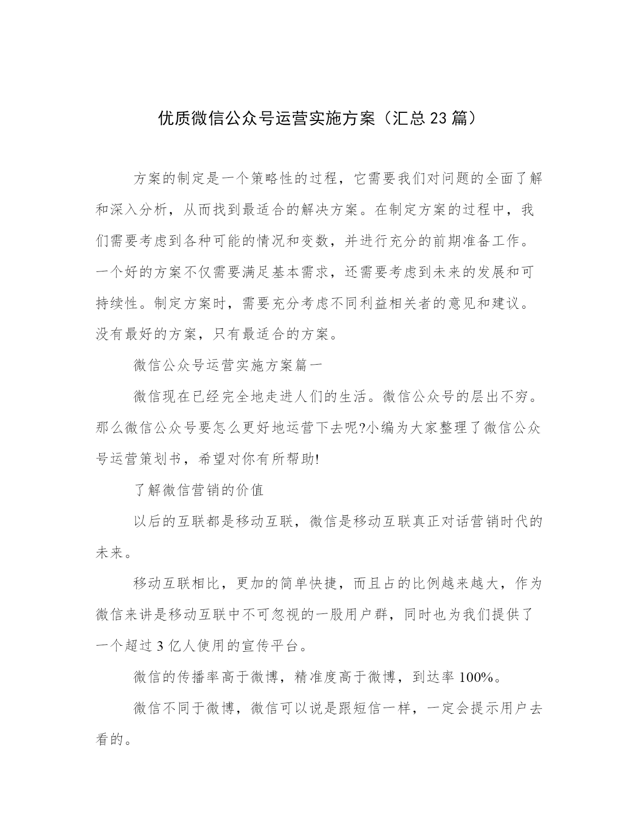 优质微信公众号运营实施方案(汇总23篇)方案的制定是一个策略性的过程,它需要我们对问题的全面了解和深入分析,从而找到最适合的解决方案。在制定方案的过程中,我们需要考虑到各种可能的情况和变数,并进行充分的前期准备工作。一个好的方案不仅需要满足基本需求,还需要考虑到未来的发展和可持续性。制定方案时,需要充分考虑不同利益相关者的意见和建议。没有最好的方案,只有最适合的方案。微信公众号运营实施方案篇一微信现在已经完全地走进人们的生活。微信公众号的层出不穷。那么微信公众号要怎么更好地运营下去呢?小编为大家整理了微信