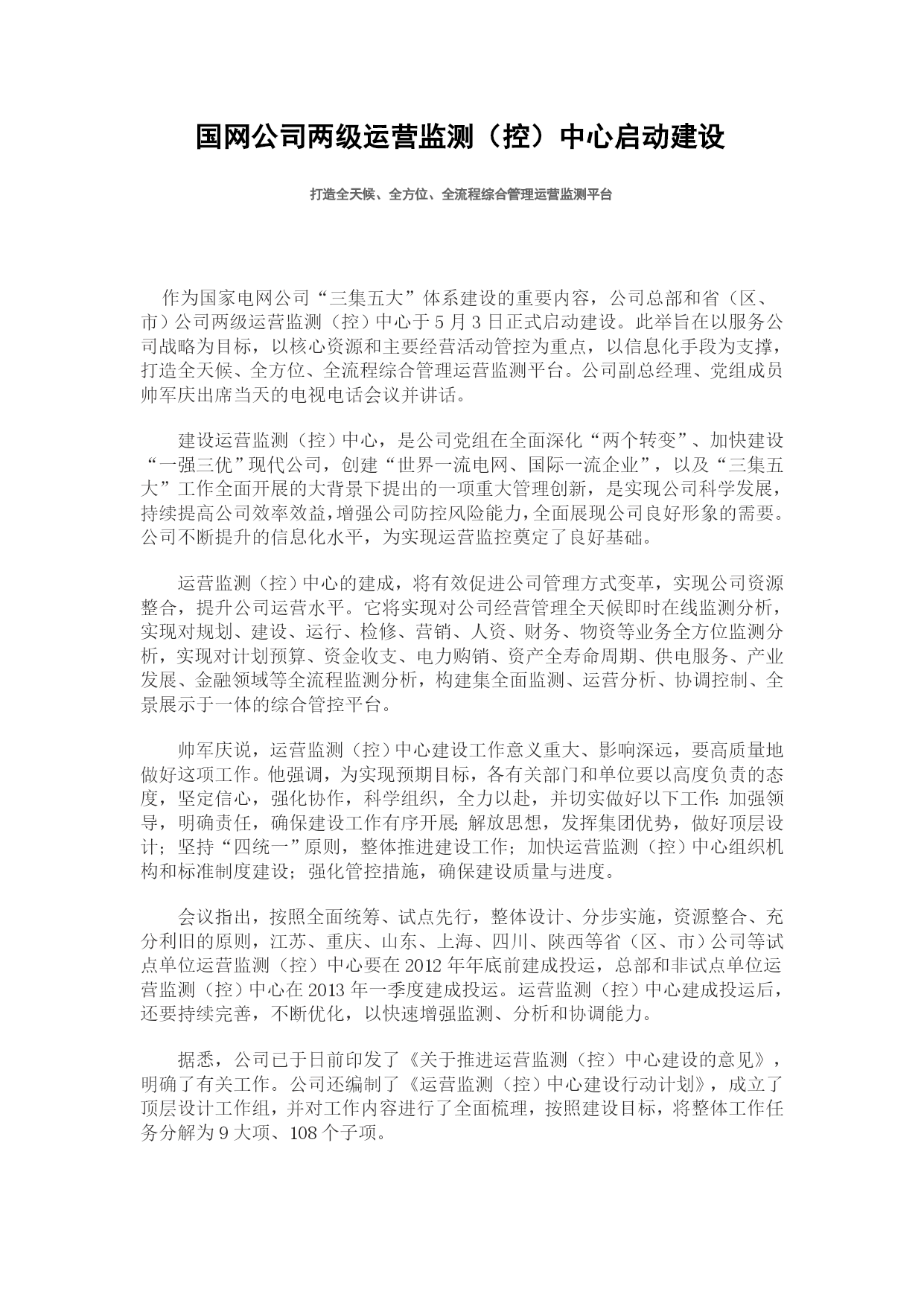 国网公司两级运营监测(控)中心启动建设打造全天候、全方位、全流程综合管理运营监测平台作者:浏览次数:17次作为国家电网公司“三集五大”体系建设的重要内容,公司总部和省(区、市)公司两级运营监测(控)中心于5月3日正式启动建设。此举旨在以服务公司战略为目标,以核心资源和主要经营活动管控为重点,以信息化手段为支撑,打造全天候、全方位、全流程综合管理运营监测平台。公司副总经理、党组成员帅军庆出席当天的电视电话会议并讲话。建设运营监测(控)中心,是公司党组在全面深化“两个转变”、加快建设“一强三优”现代公司,创建
