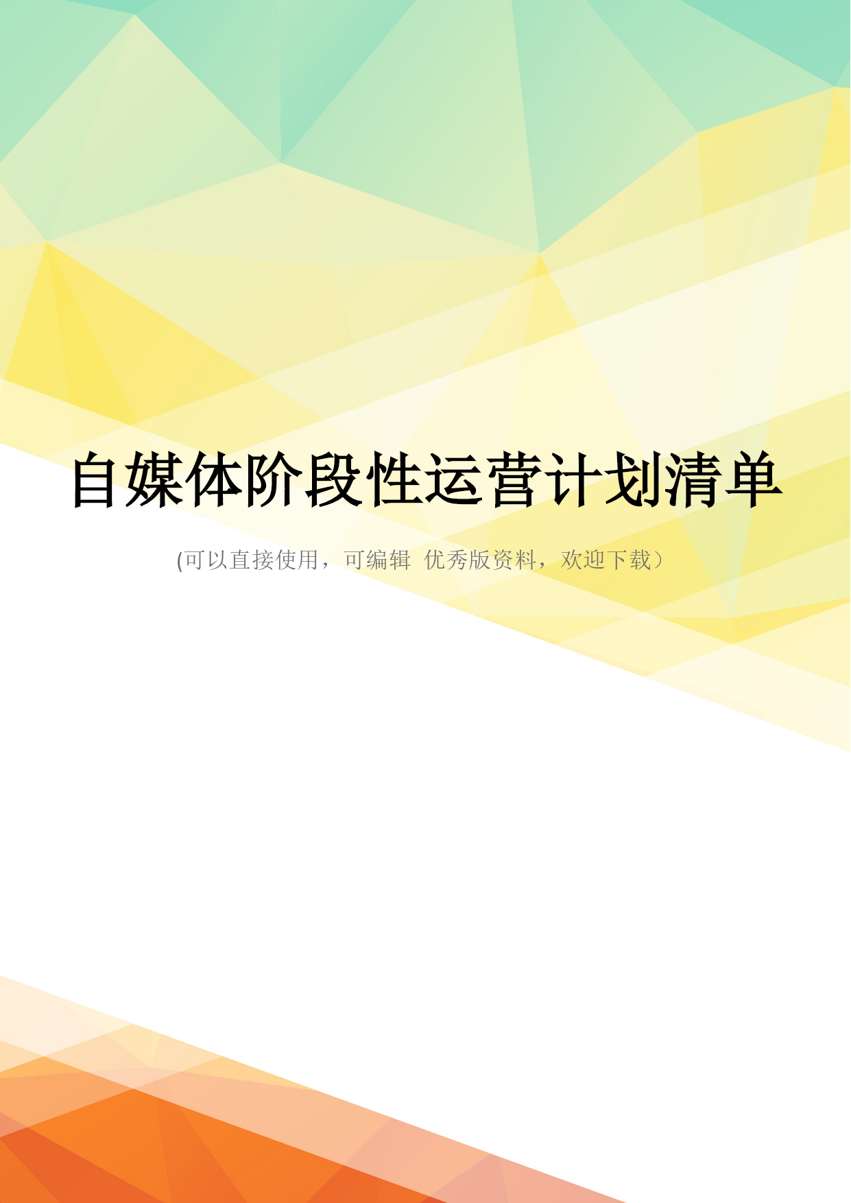 自媒体阶段性运营计划清单(可以直接使用,可编辑优秀版资料,欢迎下载)儒商金融自媒体运营阶段性计划现状分析1、微信截止2021年2月24日,儒商金融官方微信订阅号(新号)粉丝总量94人,累计发布稿件14篇,总阅读量382人次;其中发布主稿5篇,主稿平均阅读量37.8人次,主稿平均转发量2。5次.微信公众平台仍存在以下问题:a。粉丝基数较小,市场覆盖率较低,b。微信公众号功能不够健全,缺乏实质性服务c。没有常规性栏目作为展示亮点,文章推送频率过高,内容缺乏针对性、趣味性d.展现形式太过单一,排版过于简单,缺乏