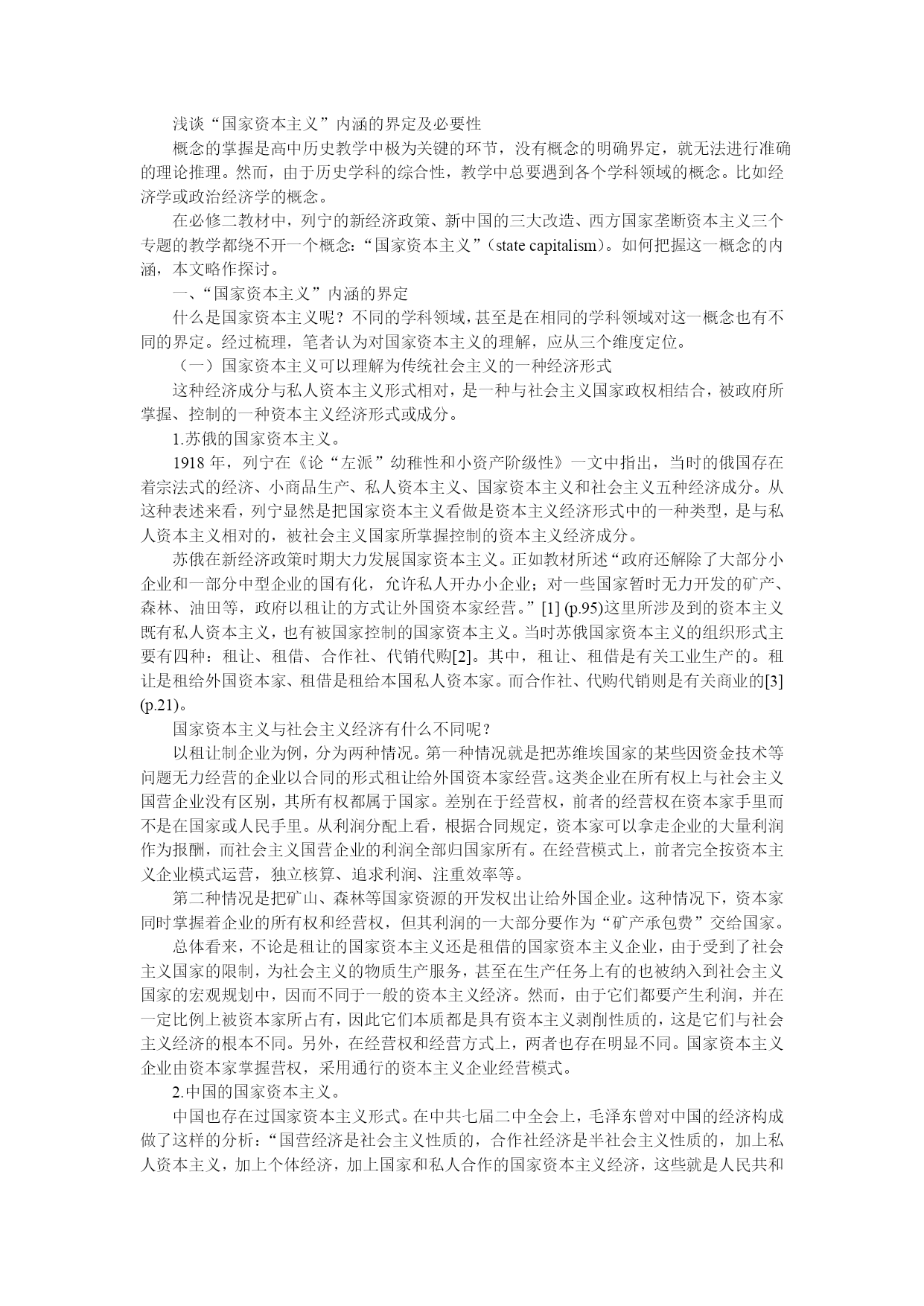 浅谈“国家资本主义”内涵的界定及必要性概念的掌握是高中历史教学中极为关键的环节,没有概念的明确界定,就无法进行准确的理论推理。然而,由于历史学科的综合性,教学中总要遇到各个学科领域的概念。比如经济学或政治经济学的概念。在必修二教材中,列宁的新经济政策、新中国的三大改造、西方国家垄断资本主义三个专题的教学都绕不开一个概念:“国家资本主义”(statecapitalism)。如何把握这一概念的内涵,本文略作探讨。一、“国家资本主义”内涵的界定什么是国家资本主义呢?不同的学科领域,甚至是在相同的学科领域对这一概