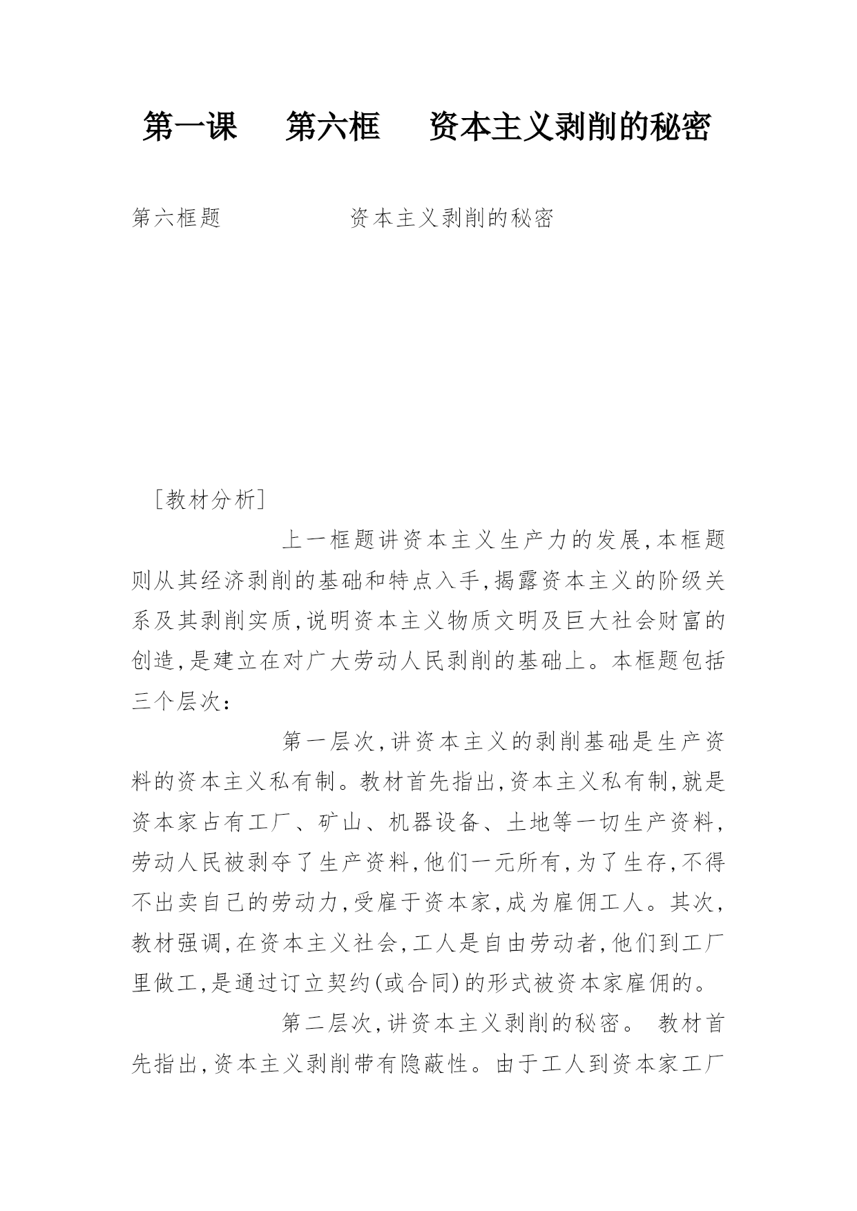 第一课第六框资本主义剥削的秘密第六框题资本主义剥削的秘密[教材分析]上一框题讲资本主义生产力的发展,本框题则从其经济剥削的基础和特点入手,揭露资本主义的阶级关系及其剥削实质,说明资本主义物质文明及巨大社会财富的创造,是建立在对广大劳动人民剥削的基础上。本框题包括三个层次:第一层次,讲资本主义的剥削基础是生产资料的资本主义私有制。教材首先指出,资本主义私有制,就是资本家占有工厂、矿山、机器设备、土地等一切生产资料,劳动人民被剥夺了生产资料,他们一元所有,为了生存,不得不出卖自己的劳动力,受雇于资本家,成为雇