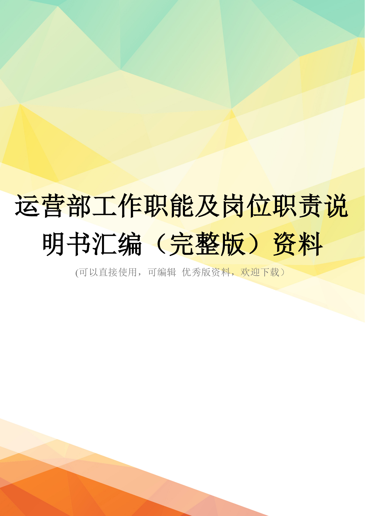 运营部工作职能及岗位职责说明书汇编(完整版)资料(可以直接使用,可编辑优秀版资料,欢迎下载)天马行空官方博客:;QQ:1318241189;QQ群:175569632集团运营管理二部工作职能及岗位职责说明书(Ⅱ稿)根据集团管理变革方案,运营管理二部主要分管范围为集团所属科技、酒店、贸易及集团直接投资的相关企业。一、工作职能概述(一)板块企业经营计划组织指导和审核职能依据集团中长期发展战略,组织研究和指导板块企业制定年度经营计划;协调、评估和审核板块企业制定的年度经营计划;跟踪、了解和评估板块企业年度经营计