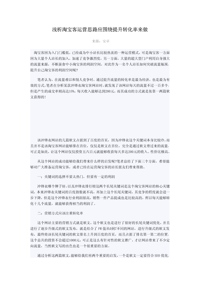 浅析淘宝客运营思路应围绕提升转化率来做来源:安卓淘宝客因为入门门槛低,已经成为中小站长比较热衷的一种运营模式,可是淘宝客一方面因为大量个人站长的加入,加速了竞争激烈度,另一方面,大量的超大型门户利用自身强大的流量来源,不断蚕食中小淘宝客的利润空间,对此作为一名个人站长如何突破流量瓶颈,提升自己淘宝客的利润空间呢?笔者认为,在流量难以和别人竞争时,通过提升流量的转化率是最为经济,也是最为有效的方式,笔者在分析某款冲锋衣淘宝客网站时,就发现了该网站每天的流量不过一百多个,但是产生的成交率则高达15%,每天收入