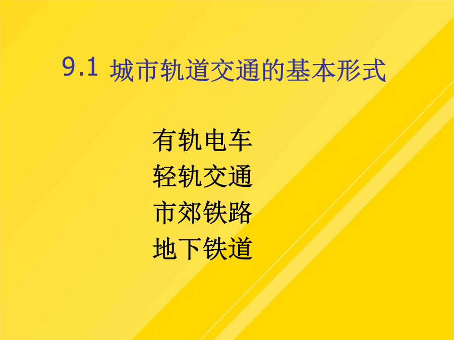 9.1城市轨道交通的基本形式轻轨的涵义是指车辆对轨道施加的荷载而言,轻轨车辆与市郊列车或地下铁道车辆比较相对较轻。轻轨交通是由电力牵引、轮轨导向、车辆编组运行在专用行车道上的中运量的城市轨道交通系统。8.1.3市郊铁路8.1.4地下铁道3城市轨道交通运营方案(1)售票、检票位置与出入口、楼梯应保持一定距离。(4)施工列车应按闭塞方式运行。(2)接触式IC卡型自动售检票系统。(8)换乘站能力使用计划。部分列车跨多站停车方案示意图(10)列车交路计划,指存在长短交路配合时的情况。这时,基本闭塞方法为自动闭塞法