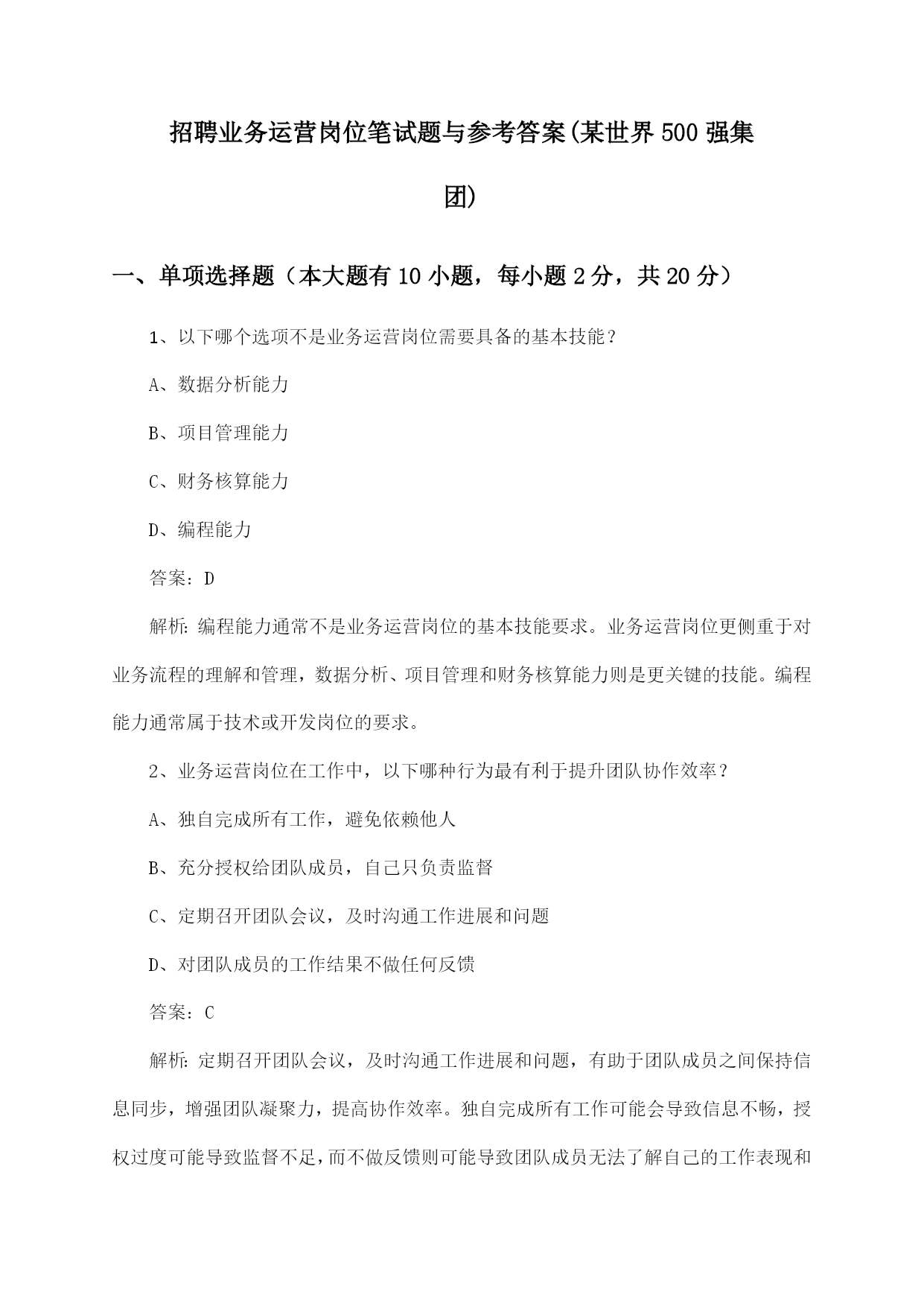 业务运营岗位招聘笔试题与参考答案(某世界500强集团).docx
