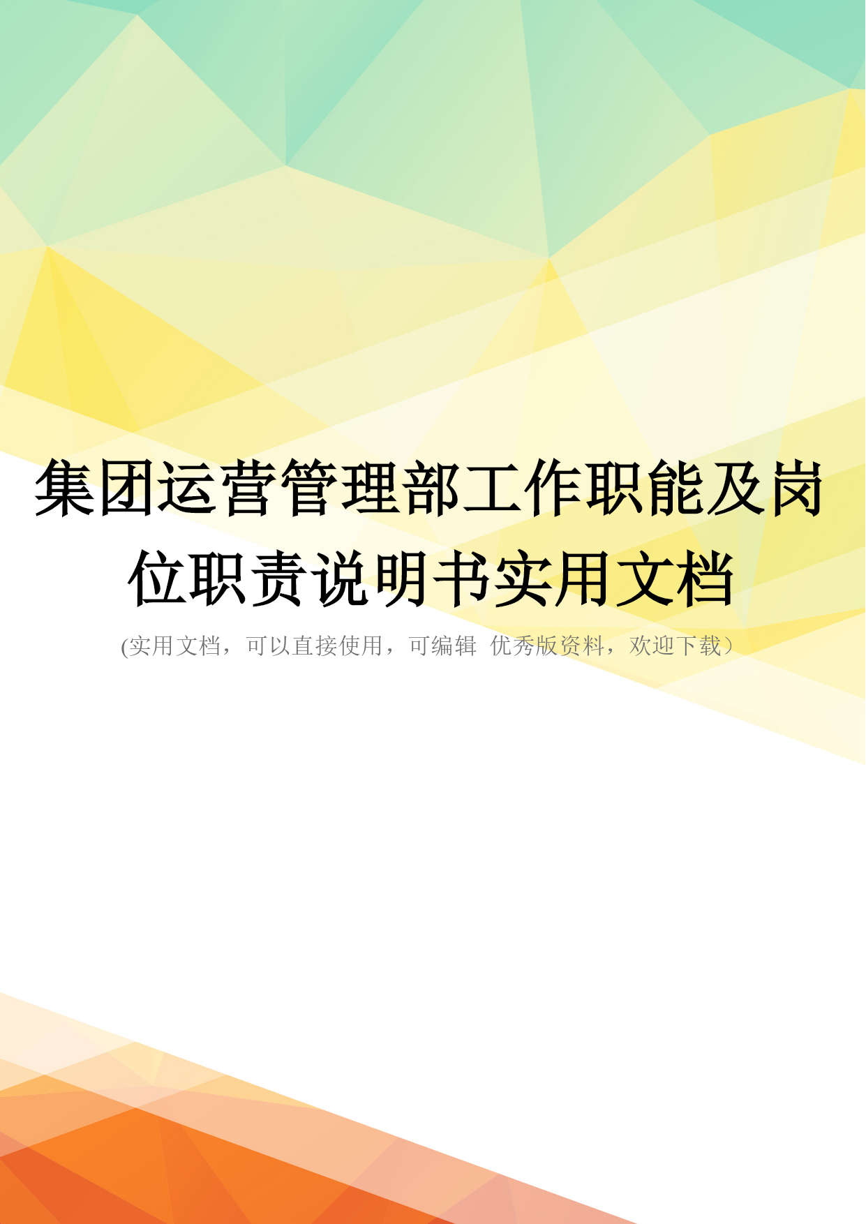 集团运营管理部工作职能及岗位职责说明书实用文档(实用文档,可以直接使用,可编辑优秀版资料,欢迎下载)集团运营管理二部工作职能及岗位职责说明书(Ⅱ稿)根据集团管理变革方案,运营管理二部主要分管范围为集团所属科技、酒店、贸易及集团直接投资的相关企业.一、工作职能概述(一)板块企业经营计划组织指导和审核职能依据集团中长期发展战略,组织研究和指导板块企业制定年度经营计划;协调、评估和审核板块企业制定的年度经营计划;跟踪、了解和评估板块企业年度经营计划的进展执行情况,结合集团内外部环境以及板块企业运营状况,适时提出