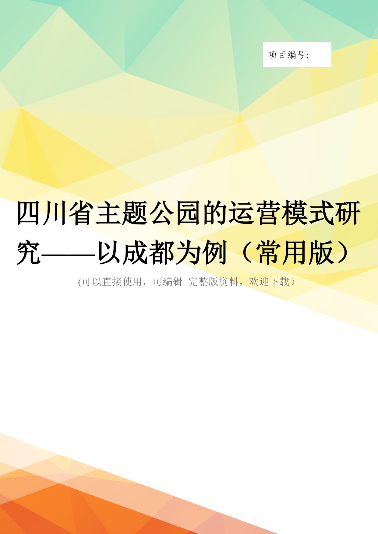 四川省主题公园的运营模式研究——以成都为例(常用版)(可以直接使用,可编辑完整版资料,欢迎下载)项目编号:西南财经大学学生科研创新项目申请书项目名称:四川省主题公园的运营模式研究——以成都为例项目类别:一般学习型项目申请人:所在(院)系:会计学院申请人电话:申请人电子信箱:指导老师:导师职称:副教授导师所在单位:西南财经大学财税学院导师电话:导师电子信箱:共青团西南财经大学委员会制2012年10月10日目录一、项目申请人情况3二、项目申请人对研究简要说明6(一)立论依据41.研究意义42.国内外现状分析4