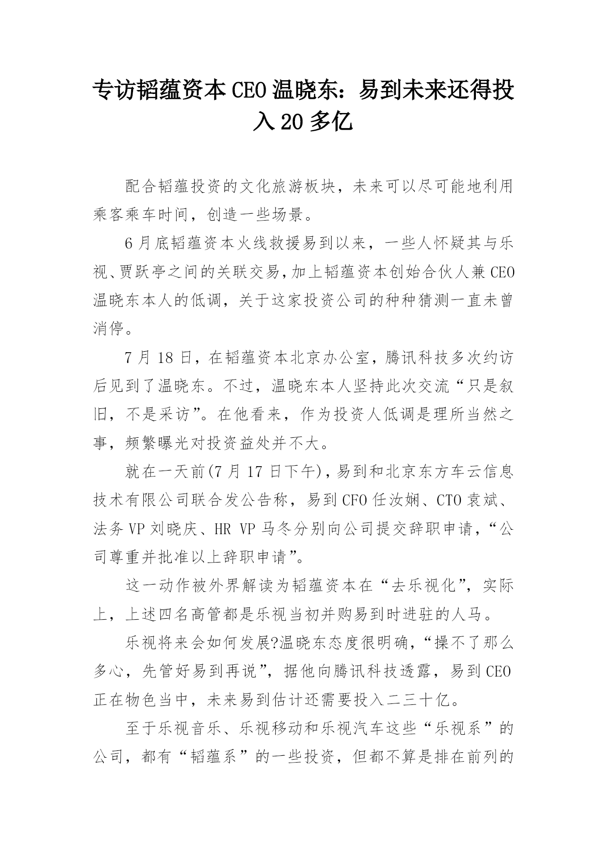 专访韬蕴资本CEO温晓东:易到未来还得投入20多亿.docx