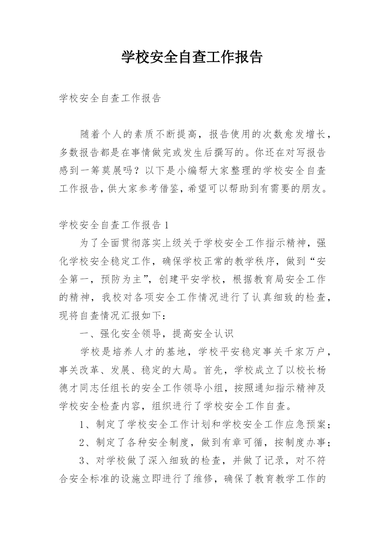 学校安全自查工作报告学校安全自查工作报告随着个人的素质不断提高,报告使用的次数愈发增长,多数报告都是在事情做完或发生后撰写的。你还在对写报告感到一筹莫展吗?以下是小编帮大家整理的学校安全自查工作报告,供大家参考借鉴,希望可以帮助到有需要的朋友。学校安全自查工作报告1为了全面贯彻落实上级关于学校安全工作指示精神,强化学校安全稳定工作,确保学校正常的教学秩序,做到“安全第一,预防为主”,创建平安学校,根据教育局安全工作的精神,我校对各项安全工作情况进行了认真细致的检查,现将自查情况汇报如下:一、强化安全领导,