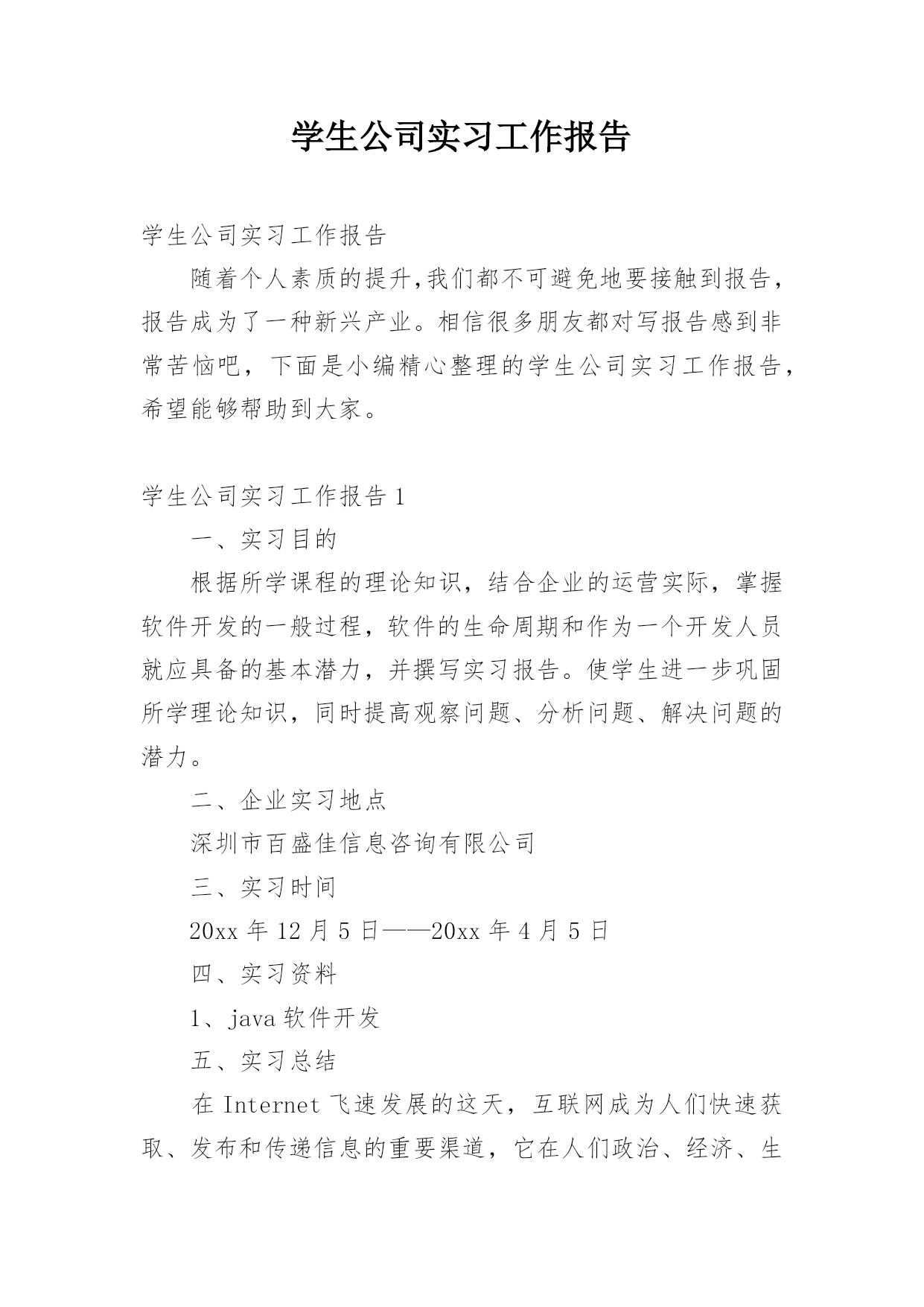 学生公司实习工作报告学生公司实习工作报告随着个人素质的提升,我们都不可避免地要接触到报告,报告成为了一种新兴产业。相信很多朋友都对写报告感到非常苦恼吧,下面是小编精心整理的学生公司实习工作报告,希望能够帮助到大家。学生公司实习工作报告1一、实习目的根据所学课程的理论知识,结合企业的运营实际,掌握软件开发的一般过程,软件的生命周期和作为一个开发人员就应具备的基本潜力,并撰写实习报告。使学生进一步巩固所学理论知识,同时提高观察问题、分析问题、解决问题的潜力。二、企业实习地点深圳市百盛佳信息咨询有限公司三、实习