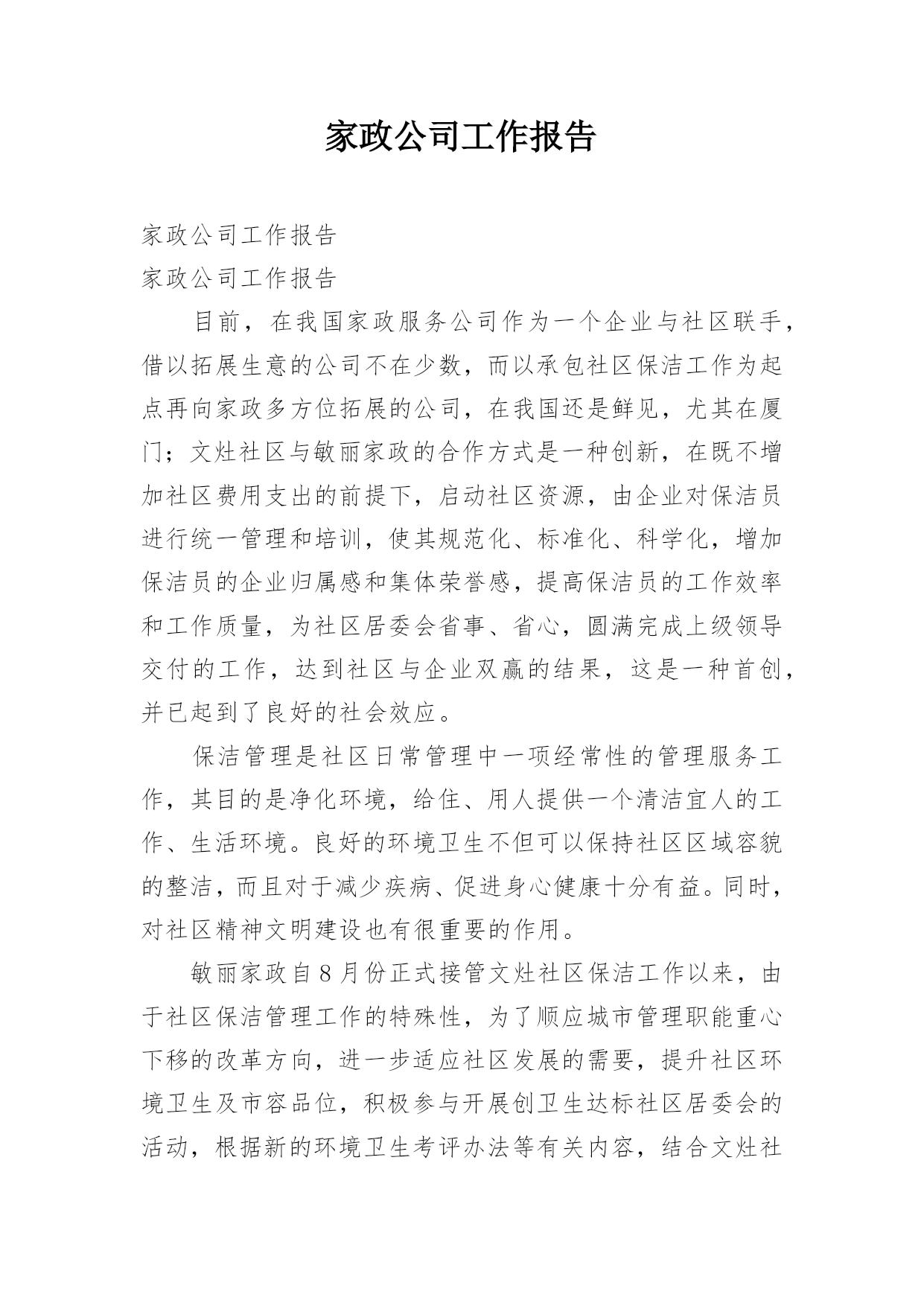 家政公司工作报告家政公司工作报告家政公司工作报告目前,在我国家政服务公司作为一个企业与社区联手,借以拓展生意的公司不在少数,而以承包社区保洁工作为起点再向家政多方位拓展的公司,在我国还是鲜见,尤其在厦门;文灶社区与敏丽家政的合作方式是一种创新,在既不增加社区费用支出的前提下,启动社区资源,由企业对保洁员进行统一管理和培训,使其规范化、标准化、科学化,增加保洁员的企业归属感和集体荣誉感,提高保洁员的工作效率和工作质量,为社区居委会省事、省心,圆满完成上级领导交付的工作,达到社区与企业双赢的结果,这是一种首创