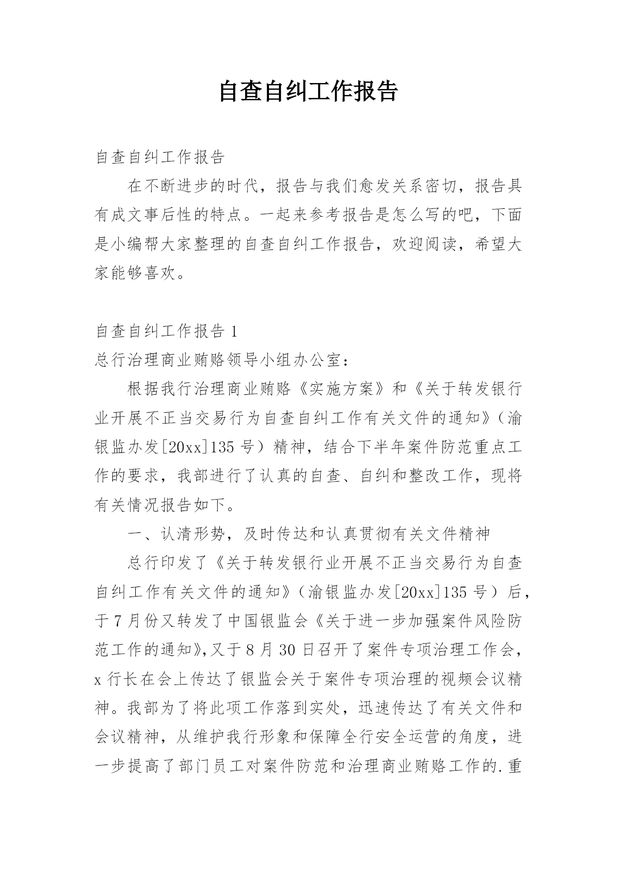 自查自纠工作报告自查自纠工作报告在不断进步的时代,报告与我们愈发关系密切,报告具有成文事后性的特点。一起来参考报告是怎么写的吧,下面是小编帮大家整理的自查自纠工作报告,欢迎阅读,希望大家能够喜欢。自查自纠工作报告1总行治理商业贿赂领导小组办公室:根据我行治理商业贿赂《实施方案》和《关于转发银行业开展不正当交易行为自查自纠工作有关文件的通知》(渝银监办发[20xx]135号)精神,结合下半年案件防范重点工作的要求,我部进行了认真的自查、自纠和整改工作,现将有关情况报告如下。一、认清形势,及时传达和认真贯彻有