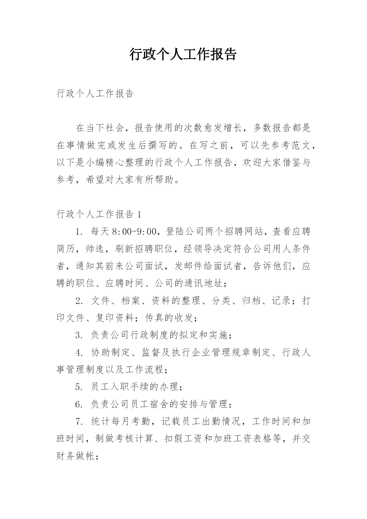 行政个人工作报告行政个人工作报告在当下社会,报告使用的次数愈发增长,多数报告都是在事情做完或发生后撰写的。在写之前,可以先参考范文,以下是小编精心整理的行政个人工作报告,欢迎大家借鉴与参考,希望对大家有所帮助。行政个人工作报告11.每天8:00-9:00,登陆公司两个招聘网站,查看应聘简历,帅选,刷新招聘职位,经领导决定符合公司用人条件者,通知其前来公司面试,发邮件给面试者,告诉他们,应聘的职位、应聘时间、公司的通讯地址;2.文件、档案、资料的整理、分类、归档、记录;打印文件、复印资料;传真的收发;3.负
