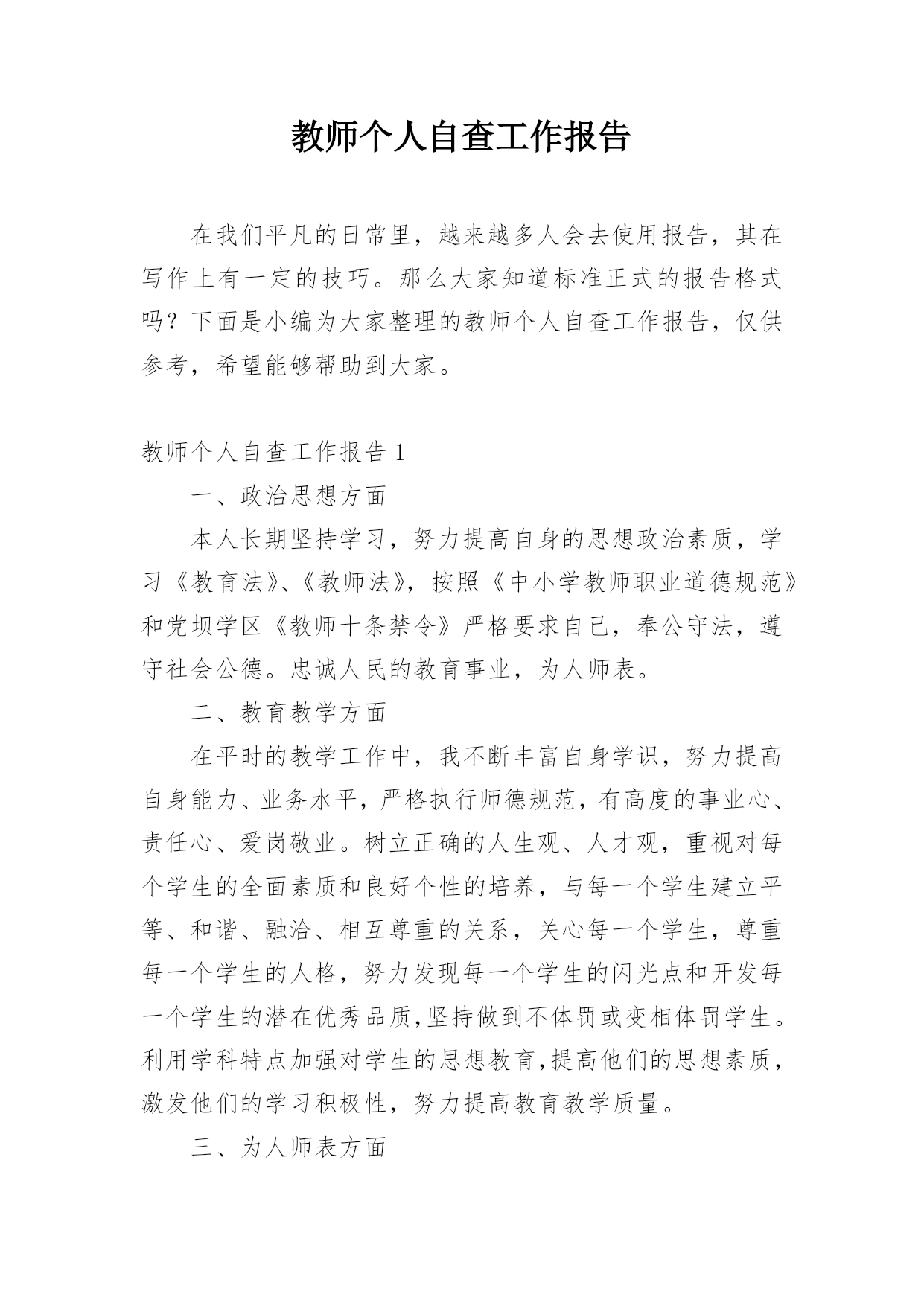 教师个人自查工作报告在我们平凡的日常里,越来越多人会去使用报告,其在写作上有一定的技巧。那么大家知道标准正式的报告格式吗?下面是小编为大家整理的教师个人自查工作报告,仅供参考,希望能够帮助到大家。教师个人自查工作报告1一、政治思想方面本人长期坚持学习,努力提高自身的思想政治素质,学习《教育法》、《教师法》,按照《中小学教师职业道德规范》和党坝学区《教师十条禁令》严格要求自己,奉公守法,遵守社会公德。忠诚人民的教育事业,为人师表。二、教育教学方面在平时的教学工作中,我不断丰富自身学识,努力提高自身能力、业务