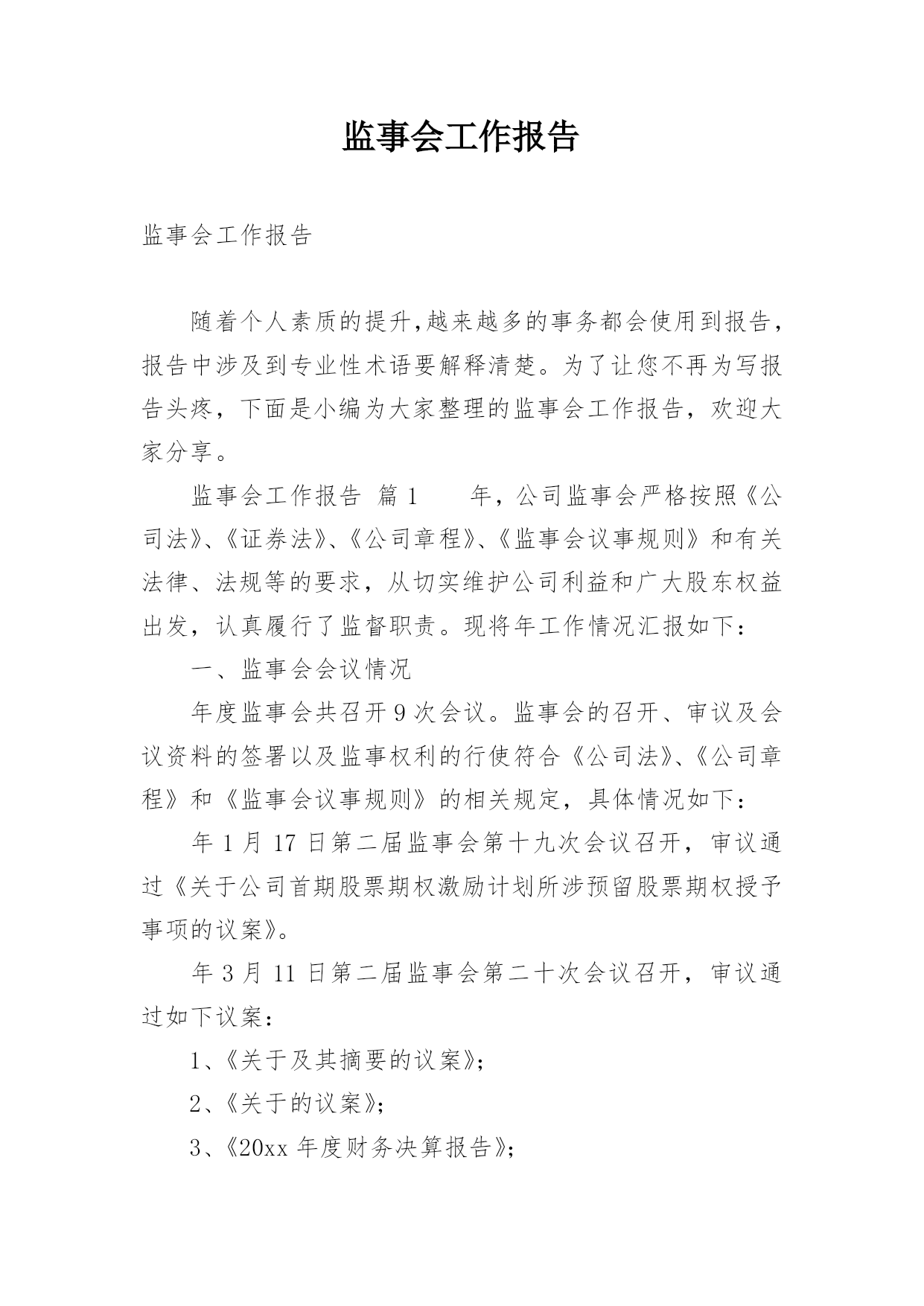 监事会工作报告监事会工作报告随着个人素质的提升,越来越多的事务都会使用到报告,报告中涉及到专业性术语要解释清楚。为了让您不再为写报告头疼,下面是小编为大家整理的监事会工作报告,欢迎大家分享。监事会工作报告篇1年,公司监事会严格按照《公司法》、《证券法》、《公司章程》、《监事会议事规则》和有关法律、法规等的要求,从切实维护公司利益和广大股东权益出发,认真履行了监督职责。现将年工作情况汇报如下:一、监事会会议情况年度监事会共召开9次会议。监事会的召开、审议及会议资料的签署以及监事权利的行使符合《公司法》、《公