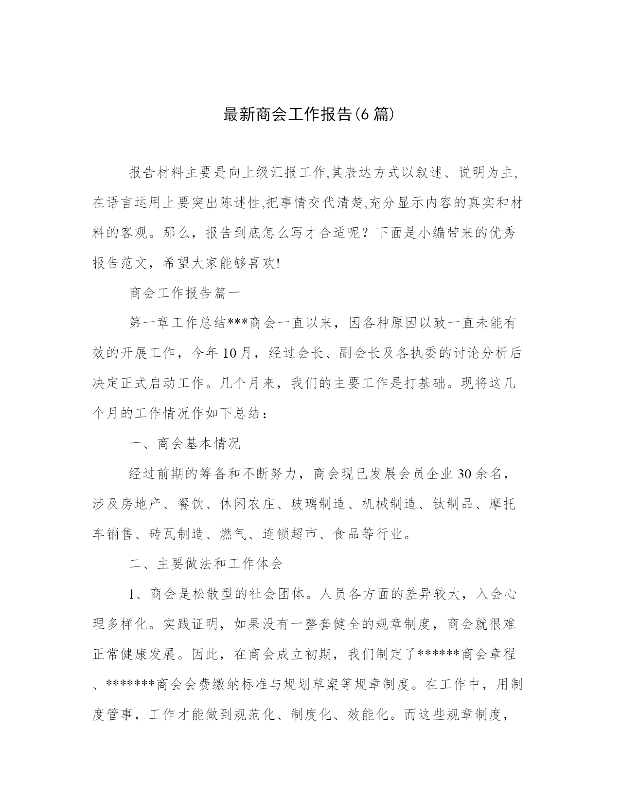 最新商会工作报告(6篇)报告材料主要是向上级汇报工作,其表达方式以叙述、说明为主,在语言运用上要突出陈述性,把事情交代清楚,充分显示内容的真实和材料的客观。那么,报告到底怎么写才合适呢?下面是小编带来的优秀报告范文,希望大家能够喜欢!商会工作报告篇一第一章工作总结***商会一直以来,因各种原因以致一直未能有效的开展工作,今年10月,经过会长、副会长及各执委的讨论分析后决定正式启动工作。几个月来,我们的主要工作是打基础。现将这几个月的工作情况作如下总结:一、商会基本情况经过前期的筹备和不断努力,商会现已发展