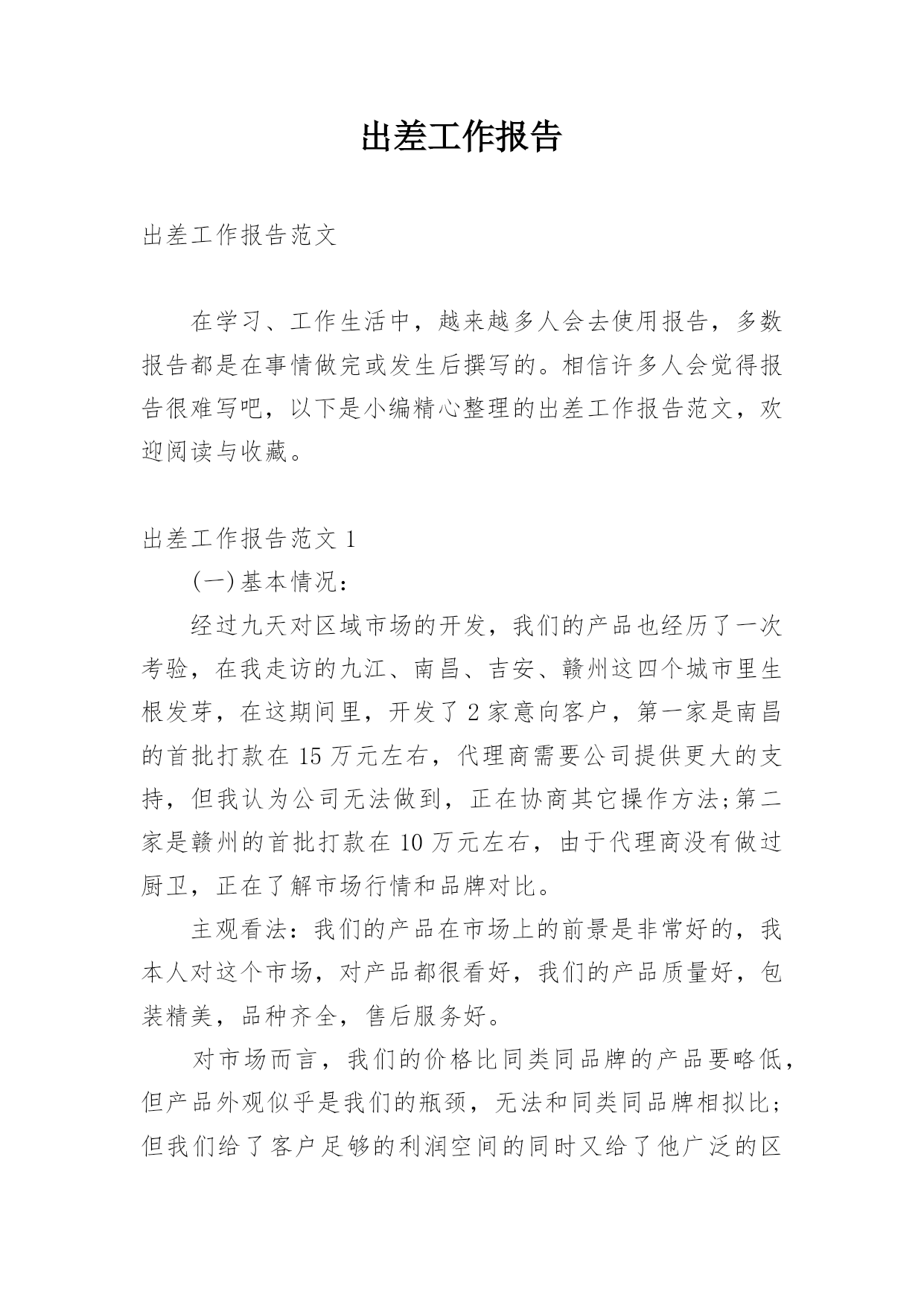 出差工作报告出差工作报告范文在学习、工作生活中,越来越多人会去使用报告,多数报告都是在事情做完或发生后撰写的。相信许多人会觉得报告很难写吧,以下是小编精心整理的出差工作报告范文,欢迎阅读与收藏。出差工作报告范文1(一)基本情况:经过九天对区域市场的开发,我们的产品也经历了一次考验,在我走访的九江、南昌、吉安、赣州这四个城市里生根发芽,在这期间里,开发了2家意向客户,第一家是南昌的首批打款在15万元左右,代理商需要公司提供更大的支持,但我认为公司无法做到,正在协商其它操作方法;第二家是赣州的首批打款在10万