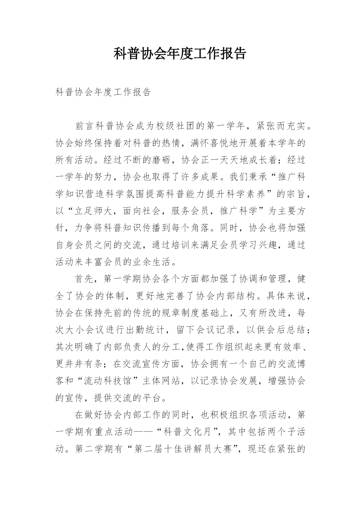 科普协会年度工作报告科普协会年度工作报告前言科普协会成为校级社团的第一学年,紧张而充实。协会始终保持着对科普的热情,满怀喜悦地开展着本学年的所有活动。经过不断的磨砺,协会正一天天地成长着;经过一学年的努力,协会也取得了许多成果。我们秉承“推广科学知识营造科学氛围提高科普能力提升科学素养”的宗旨,以“立足师大,面向社会,服务会员,推广科学”为主要方针,力争将科普知识传播到每个角落。同时,协会也将加强自身会员之间的交流,通过培训来满足会员学习兴趣,通过活动来丰富会员的业余生活。首先,第一学期协会各个方面都加强