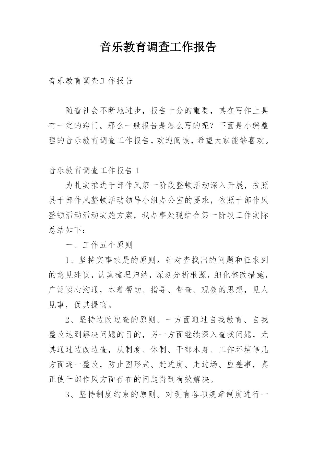 音乐教育调查工作报告音乐教育调查工作报告随着社会不断地进步,报告十分的重要,其在写作上具有一定的窍门。那么一般报告是怎么写的呢?下面是小编整理的音乐教育调查工作报告,欢迎阅读,希望大家能够喜欢。音乐教育调查工作报告1为扎实推进干部作风第一阶段整顿活动深入开展,按照县干部作风整顿活动领导小组办公室的要求,依照干部作风整顿活动活动实施方案,我办事处现结合第一阶段工作实际总结如下:一、工作五个原则1、坚持实事求是的原则。针对查找出的问题和征求到的意见建议,认真梳理归纳,深刻分析根源,细化整改措施,广泛谈心沟通,