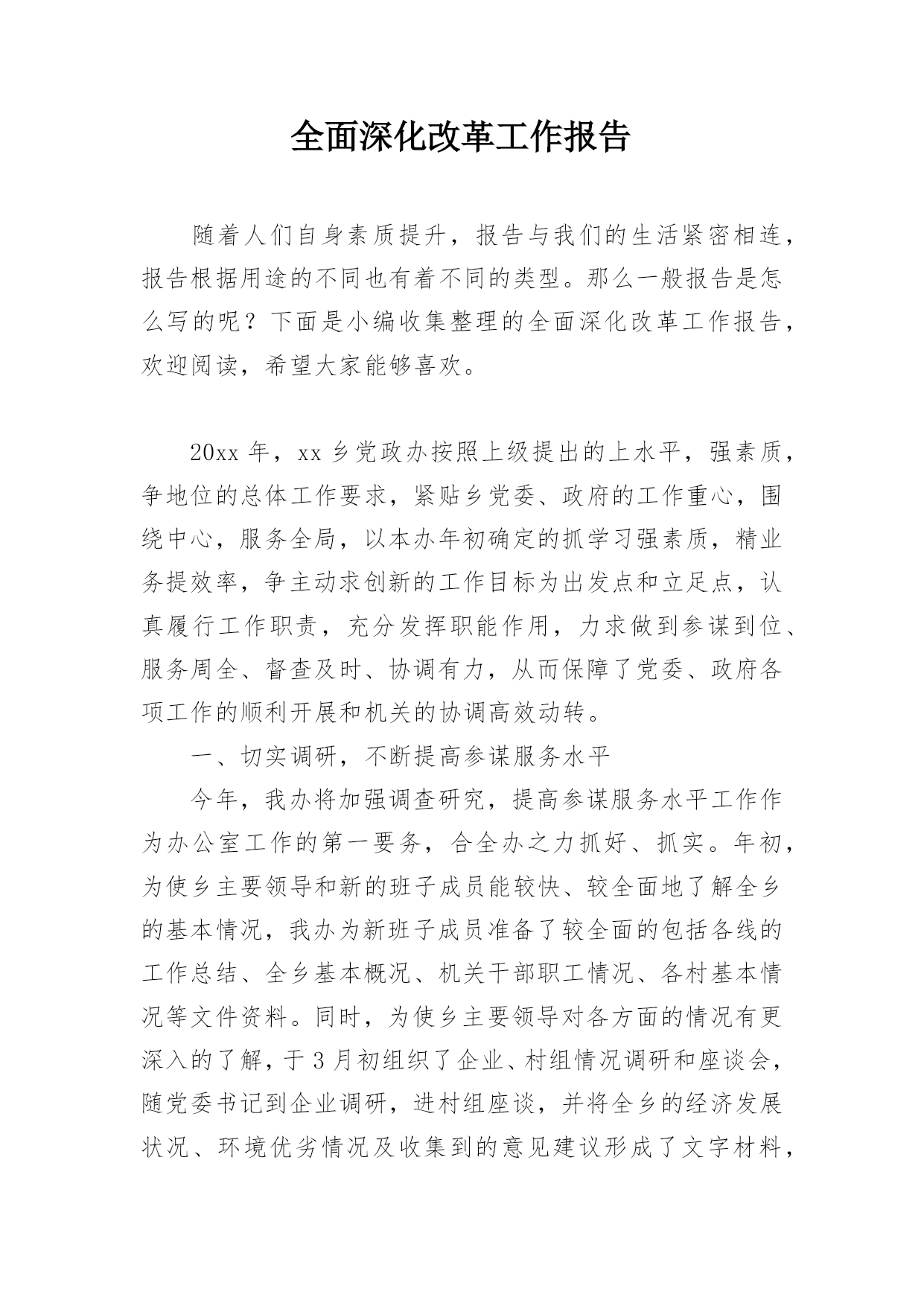 全面深化改革工作报告随着人们自身素质提升,报告与我们的生活紧密相连,报告根据用途的不同也有着不同的类型。那么一般报告是怎么写的呢?下面是小编收集整理的全面深化改革工作报告,欢迎阅读,希望大家能够喜欢。20xx年,xx乡党政办按照上级提出的上水平,强素质,争地位的总体工作要求,紧贴乡党委、政府的工作重心,围绕中心,服务全局,以本办年初确定的抓学习强素质,精业务提效率,争主动求创新的工作目标为出发点和立足点,认真履行工作职责,充分发挥职能作用,力求做到参谋到位、服务周全、督查及时、协调有力,从而保障了党委、政