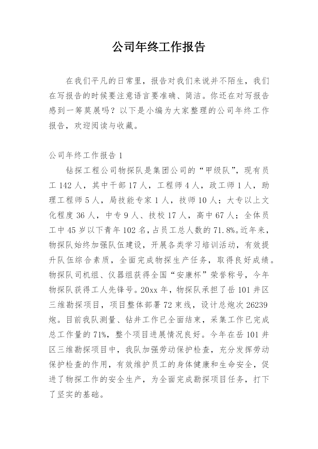 公司年终工作报告在我们平凡的日常里,报告对我们来说并不陌生,我们在写报告的时候要注意语言要准确、简洁。你还在对写报告感到一筹莫展吗?以下是小编为大家整理的公司年终工作报告,欢迎阅读与收藏。公司年终工作报告1钻探工程公司物探队是集团公司的“甲级队”,现有员工142人,其中干部17人,工程师4人,政工师1人,助理工程师5人,局技能专家1人,技师10人;大专以上文化程度36人,中专9人、技校17人,高中67人;全体员工中45岁以下青年102名,占员工总人数的71.8%。近年来,物探队始终加强队伍建设,开展各类学