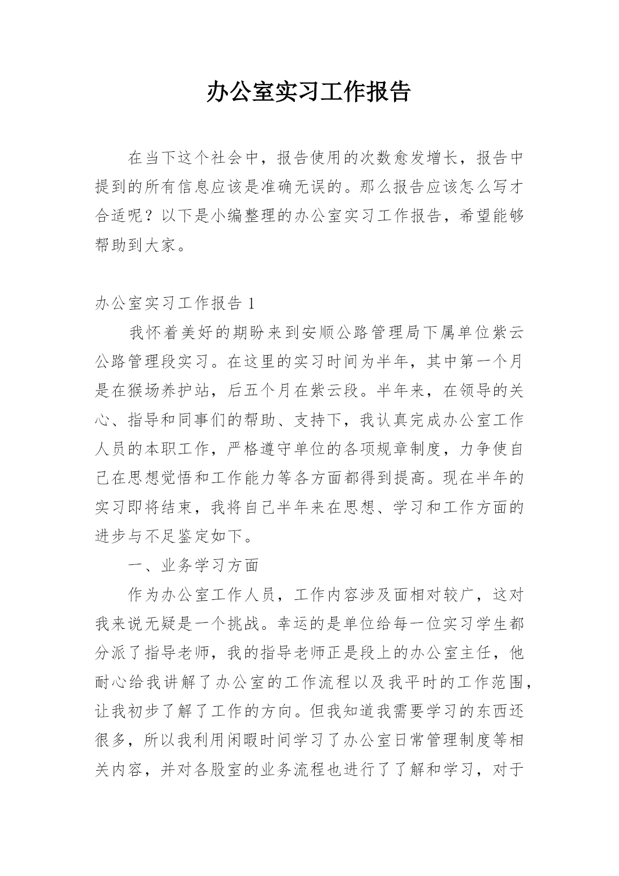 办公室实习工作报告在当下这个社会中,报告使用的次数愈发增长,报告中提到的所有信息应该是准确无误的。那么报告应该怎么写才合适呢?以下是小编整理的办公室实习工作报告,希望能够帮助到大家。办公室实习工作报告1我怀着美好的期盼来到安顺公路管理局下属单位紫云公路管理段实习。在这里的实习时间为半年,其中第一个月是在猴场养护站,后五个月在紫云段。半年来,在领导的关心、指导和同事们的帮助、支持下,我认真完成办公室工作人员的本职工作,严格遵守单位的各项规章制度,力争使自己在思想觉悟和工作能力等各方面都得到提高。现在半年的实