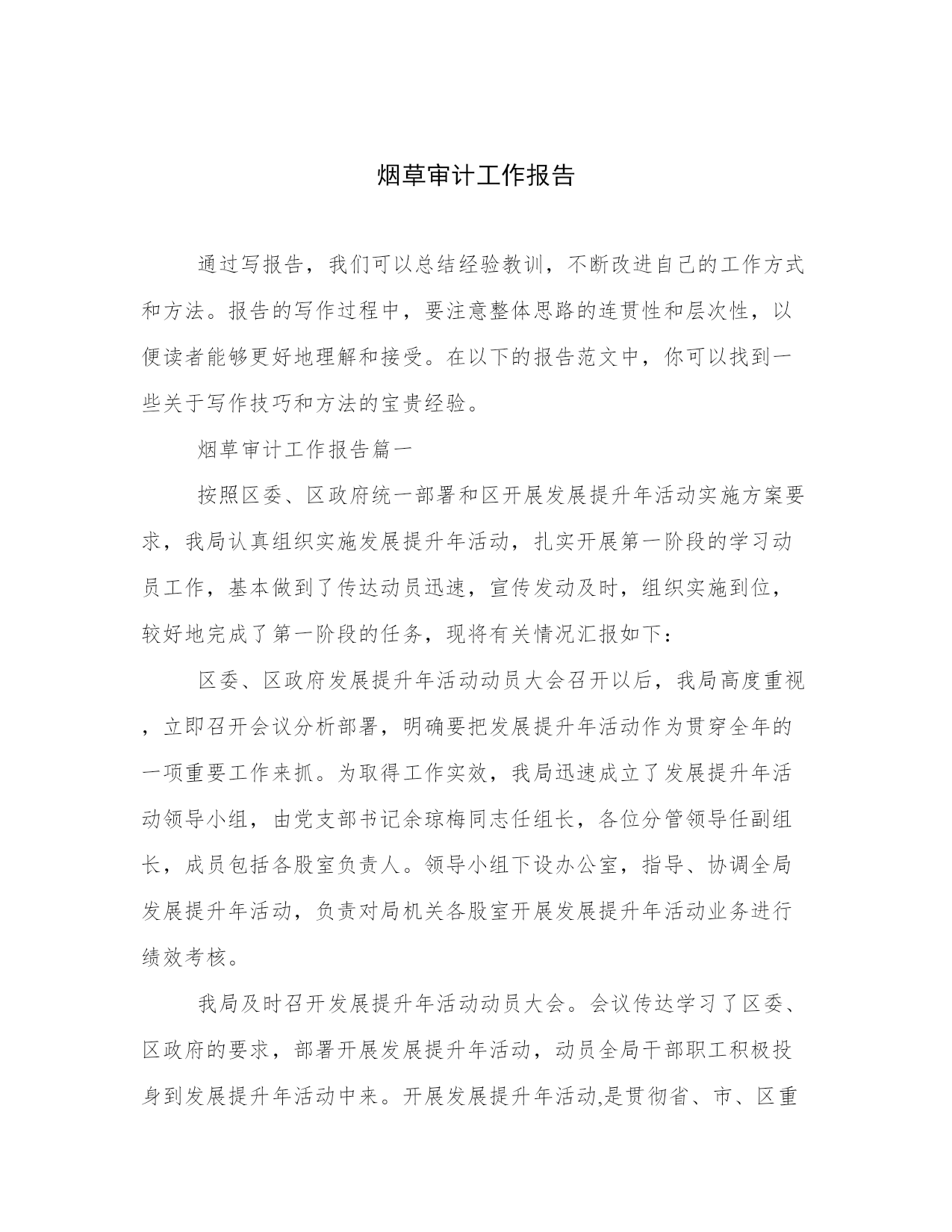 烟草审计工作报告通过写报告,我们可以总结经验教训,不断改进自己的工作方式和方法。报告的写作过程中,要注意整体思路的连贯性和层次性,以便读者能够更好地理解和接受。在以下的报告范文中,你可以找到一些关于写作技巧和方法的宝贵经验。烟草审计工作报告篇一按照区委、区政府统一部署和区开展发展提升年活动实施方案要求,我局认真组织实施发展提升年活动,扎实开展第一阶段的学习动员工作,基本做到了传达动员迅速,宣传发动及时,组织实施到位,较好地完成了第一阶段的任务,现将有关情况汇报如下:区委、区政府发展提升年活动动员大会召开以