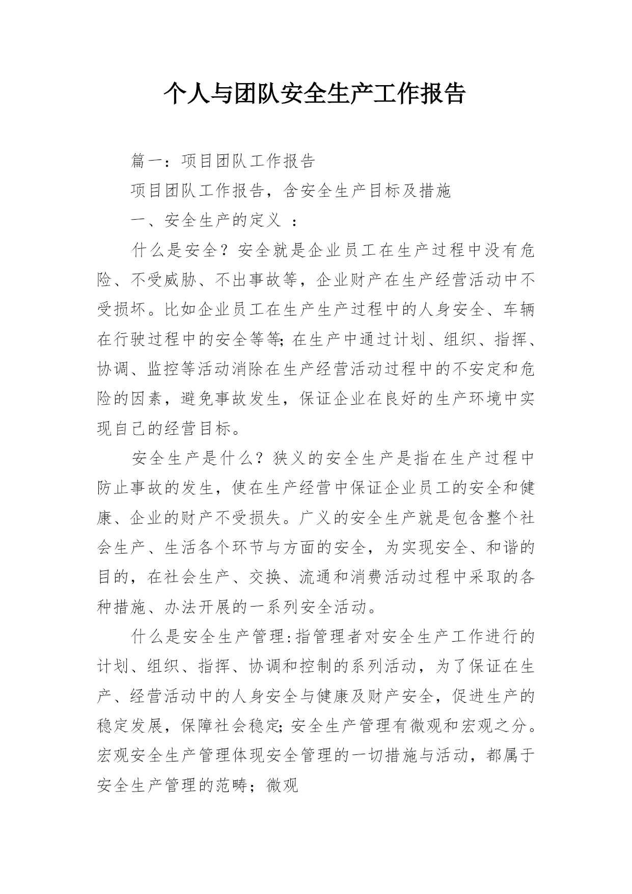 个人与团队安全生产工作报告篇一:项目团队工作报告项目团队工作报告,含安全生产目标及措施一、安全生产的定义:什么是安全?安全就是企业员工在生产过程中没有危险、不受威胁、不出事故等,企业财产在生产经营活动中不受损坏。比如企业员工在生产生产过程中的人身安全、车辆在行驶过程中的安全等等;在生产中通过计划、组织、指挥、协调、监控等活动消除在生产经营活动过程中的不安定和危险的因素,避免事故发生,保证企业在良好的生产环境中实现自己的经营目标。安全生产是什么?狭义的安全生产是指在生产过程中防止事故的发生,使在生产经营中保