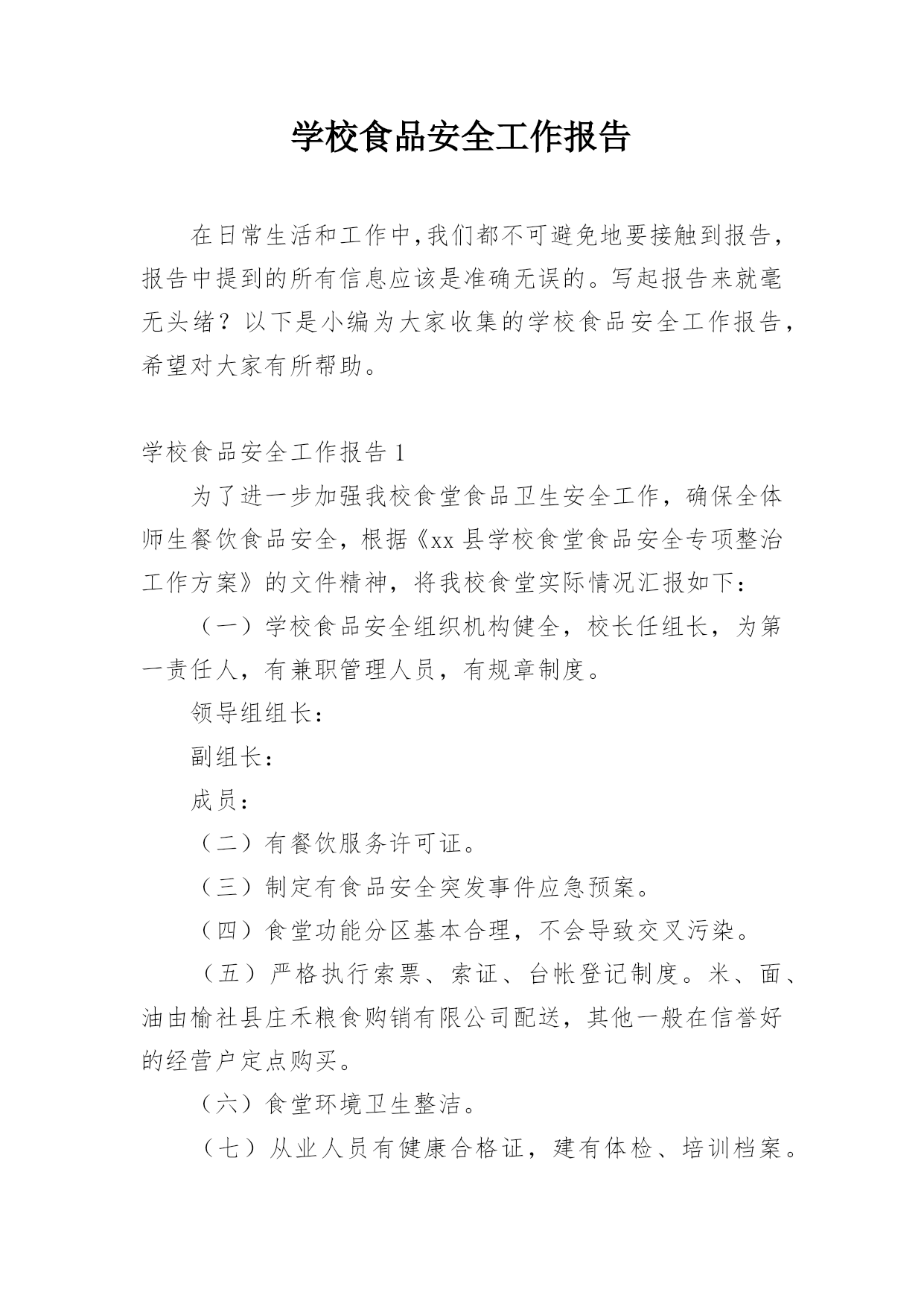 学校食品安全工作报告在日常生活和工作中,我们都不可避免地要接触到报告,报告中提到的所有信息应该是准确无误的。写起报告来就毫无头绪?以下是小编为大家收集的学校食品安全工作报告,希望对大家有所帮助。学校食品安全工作报告1为了进一步加强我校食堂食品卫生安全工作,确保全体师生餐饮食品安全,根据《xx县学校食堂食品安全专项整治工作方案》的文件精神,将我校食堂实际情况汇报如下:(一)学校食品安全组织机构健全,校长任组长,为第一责任人,有兼职管理人员,有规章制度。领导组组长:副组长:成员:(二)有餐饮服务许可证。(三)