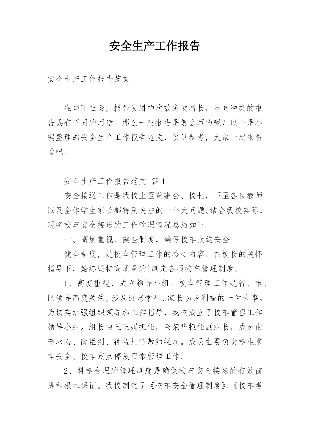 安全生产工作报告安全生产工作报告范文在当下社会,报告使用的次数愈发增长,不同种类的报告具有不同的用途。那么一般报告是怎么写的呢?以下是小编整理的安全生产工作报告范文,仅供参考,大家一起来看看吧。安全生产工作报告范文篇1安全接送工作是我校上至董事会、校长,下至各位教师以及全体学生家长都特别关注的一个大问题。结合我校实际,现将校车安全接送的工作管理情况总结如下一、高度重视、健全制度,确保校车接送安全健全制度,是校车管理工作的核心内容。在校长的关怀指导下,始终坚持高质量的`制定各项校车管理制度。1、高度重视,成