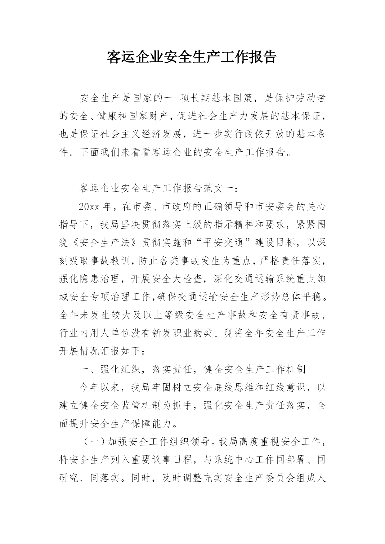 客运企业安全生产工作报告安全生产是国家的一-项长期基本国策,是保护劳动者的安全、健康和国家财产,促进社会生产力发展的基本保证,也是保证社会主义经济发展,进一步实行改依开放的基本条件。下面我们来看看客运企业的安全生产工作报告。客运企业安全生产工作报告范文一:20xx年,在市委、市政府的正确领导和市安委会的关心指导下,我局坚决贯彻落实上级的指示精神和要求,紧紧围绕《安全生产法》贯彻实施和“平安交通”建设目标,以深刻吸取事故教训,防止各类事故发生为重点,严格责任落实,强化隐患治理,开展安全大检查,深化交通运输系