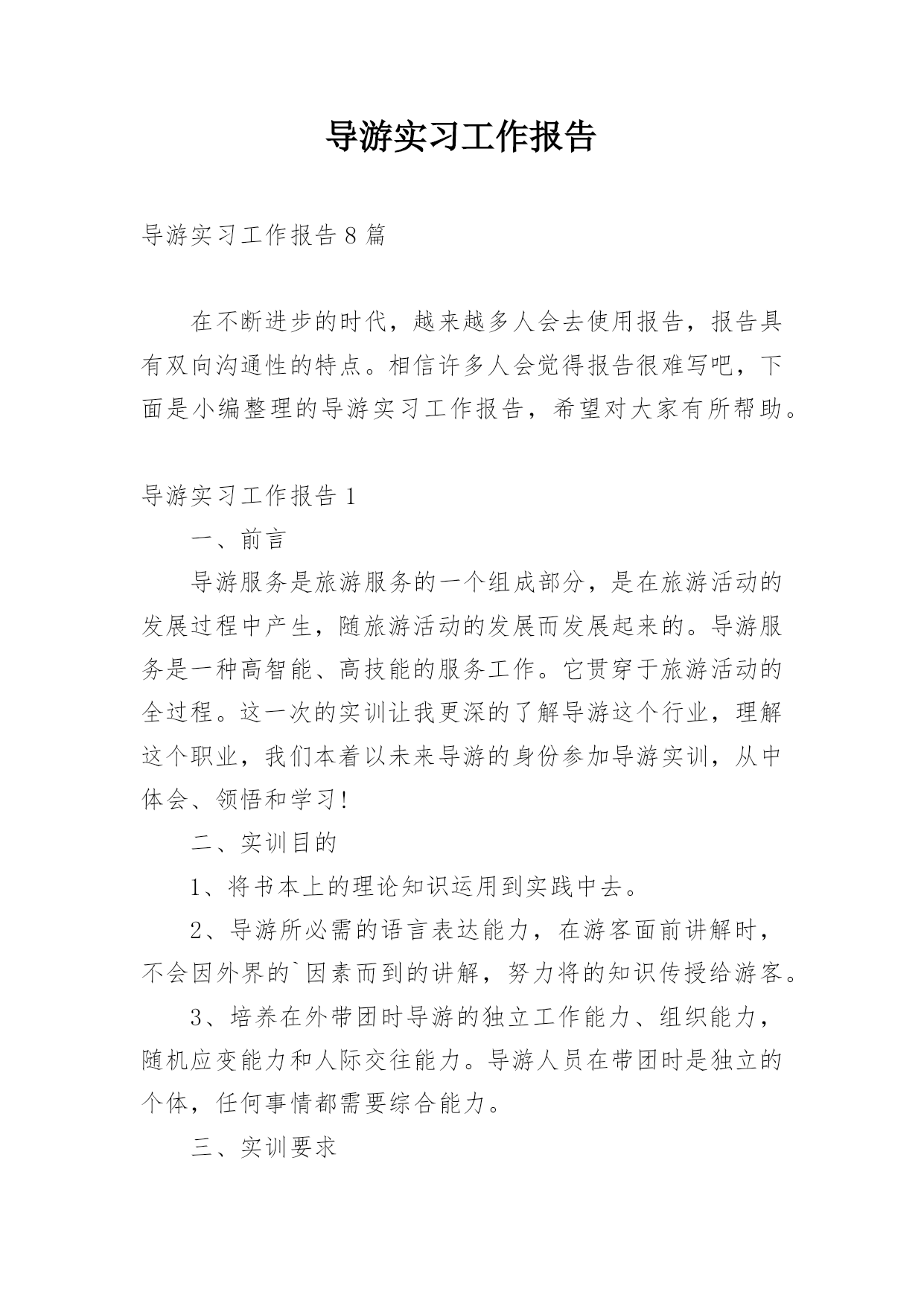 导游实习工作报告导游实习工作报告8篇在不断进步的时代,越来越多人会去使用报告,报告具有双向沟通性的特点。相信许多人会觉得报告很难写吧,下面是小编整理的导游实习工作报告,希望对大家有所帮助。导游实习工作报告1一、前言导游服务是旅游服务的一个组成部分,是在旅游活动的发展过程中产生,随旅游活动的发展而发展起来的。导游服务是一种高智能、高技能的服务工作。它贯穿于旅游活动的全过程。这一次的实训让我更深的了解导游这个行业,理解这个职业,我们本着以未来导游的身份参加导游实训,从中体会、领悟和学习!二、实训目的1、将书本