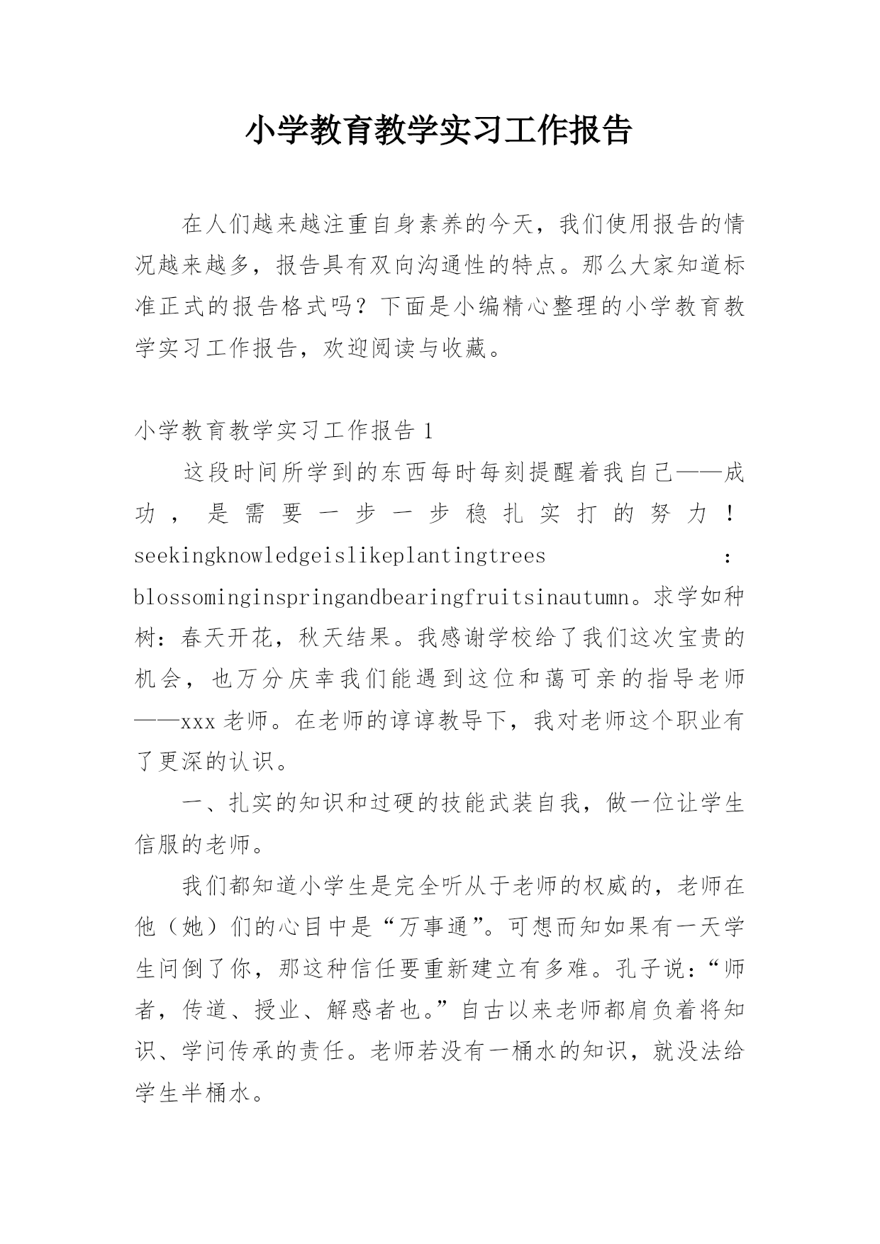 小学教育教学实习工作报告在人们越来越注重自身素养的今天,我们使用报告的情况越来越多,报告具有双向沟通性的特点。那么大家知道标准正式的报告格式吗?下面是小编精心整理的小学教育教学实习工作报告,欢迎阅读与收藏。小学教育教学实习工作报告1这段时间所学到的东西每时每刻提醒着我自己——成功,是需要一步一步稳扎实打的努力!seekingknowledgeislikeplantingtrees:blossominginspringandbearingfruitsinautumn。求学如种树:春天开花,秋天结果。我感谢学