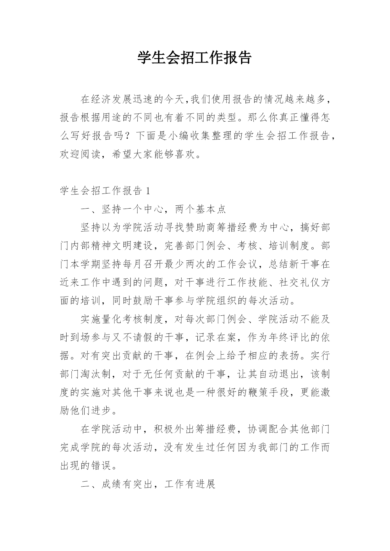 学生会招工作报告在经济发展迅速的今天,我们使用报告的情况越来越多,报告根据用途的不同也有着不同的类型。那么你真正懂得怎么写好报告吗?下面是小编收集整理的学生会招工作报告,欢迎阅读,希望大家能够喜欢。学生会招工作报告1一、坚持一个中心,两个基本点坚持以为学院活动寻找赞助商筹措经费为中心,搞好部门内部精神文明建设,完善部门例会、考核、培训制度。部门本学期坚持每月召开最少两次的工作会议,总结新干事在近来工作中遇到的问题,对干事进行工作技能、社交礼仪方面的培训,同时鼓励干事参与学院组织的每次活动。实施量化考核制度