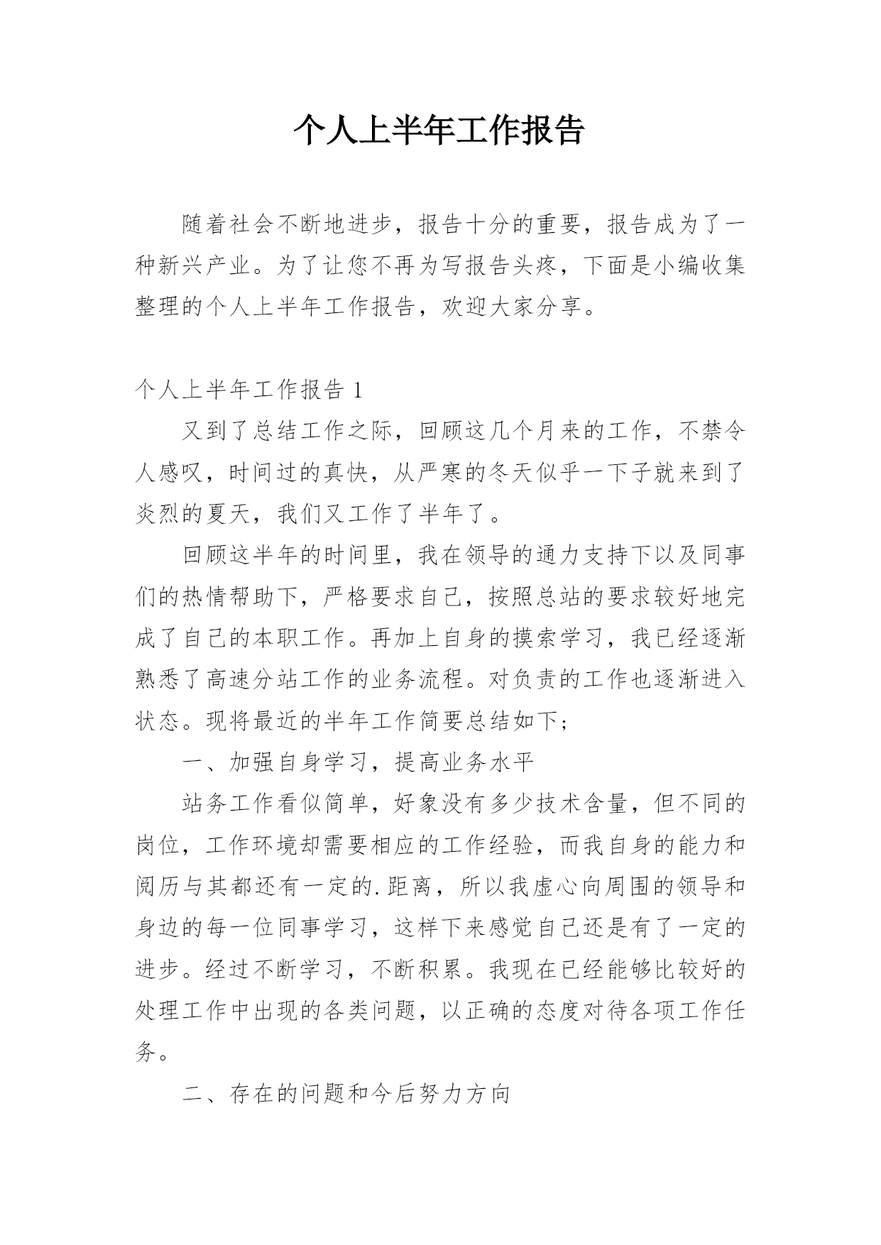 个人上半年工作报告随着社会不断地进步,报告十分的重要,报告成为了一种新兴产业。为了让您不再为写报告头疼,下面是小编收集整理的个人上半年工作报告,欢迎大家分享。个人上半年工作报告1又到了总结工作之际,回顾这几个月来的工作,不禁令人感叹,时间过的真快,从严寒的冬天似乎一下子就来到了炎烈的夏天,我们又工作了半年了。回顾这半年的时间里,我在领导的通力支持下以及同事们的热情帮助下,严格要求自己,按照总站的要求较好地完成了自己的本职工作。再加上自身的摸索学习,我已经逐渐熟悉了高速分站工作的业务流程。对负责的工作也逐渐