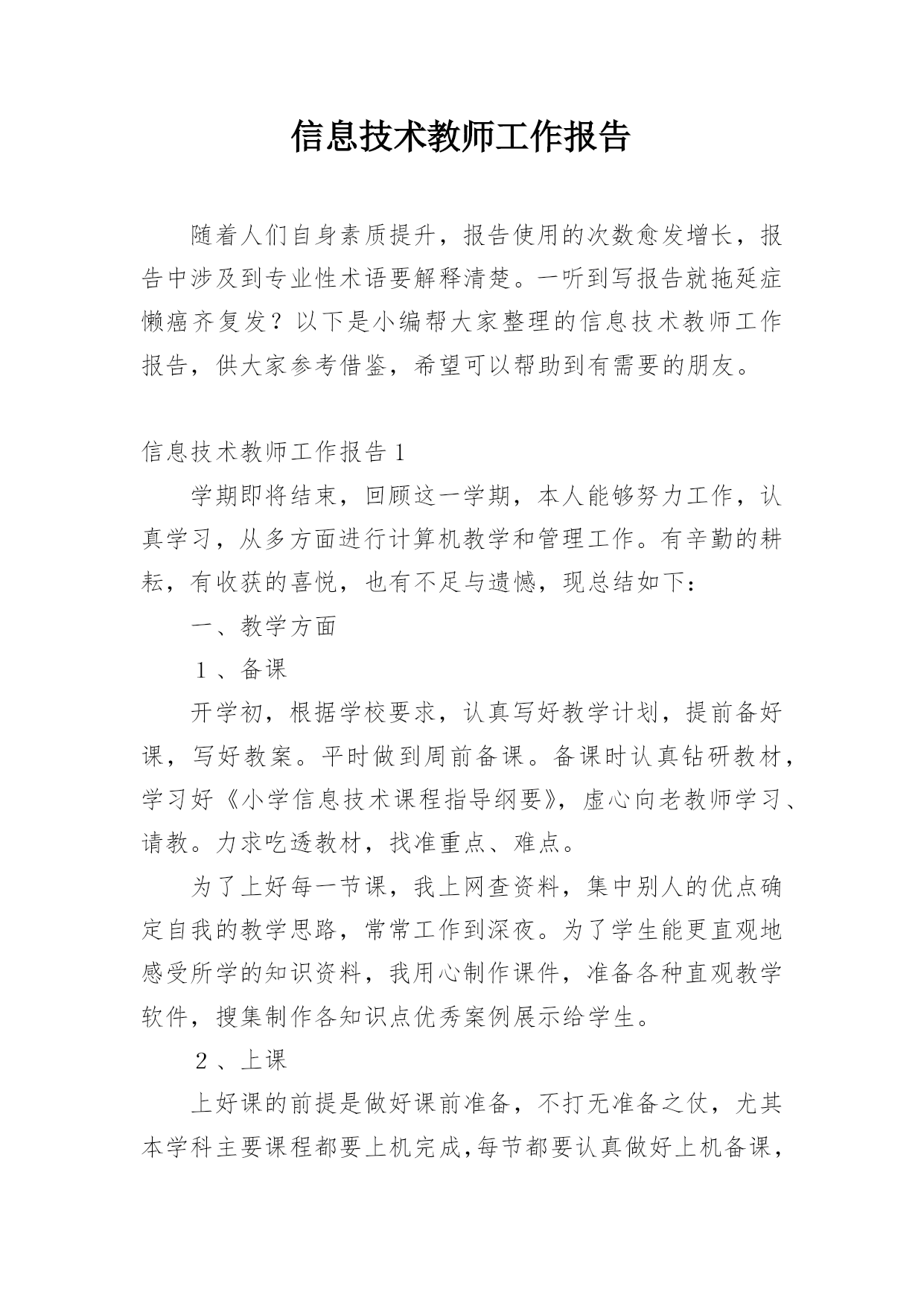 信息技术教师工作报告随着人们自身素质提升,报告使用的次数愈发增长,报告中涉及到专业性术语要解释清楚。一听到写报告就拖延症懒癌齐复发?以下是小编帮大家整理的信息技术教师工作报告,供大家参考借鉴,希望可以帮助到有需要的朋友。信息技术教师工作报告1学期即将结束,回顾这一学期,本人能够努力工作,认真学习,从多方面进行计算机教学和管理工作。有辛勤的耕耘,有收获的喜悦,也有不足与遗憾,现总结如下:一、教学方面1、备课开学初,根据学校要求,认真写好教学计划,提前备好课,写好教案。平时做到周前备课。备课时认真钻研教材,学