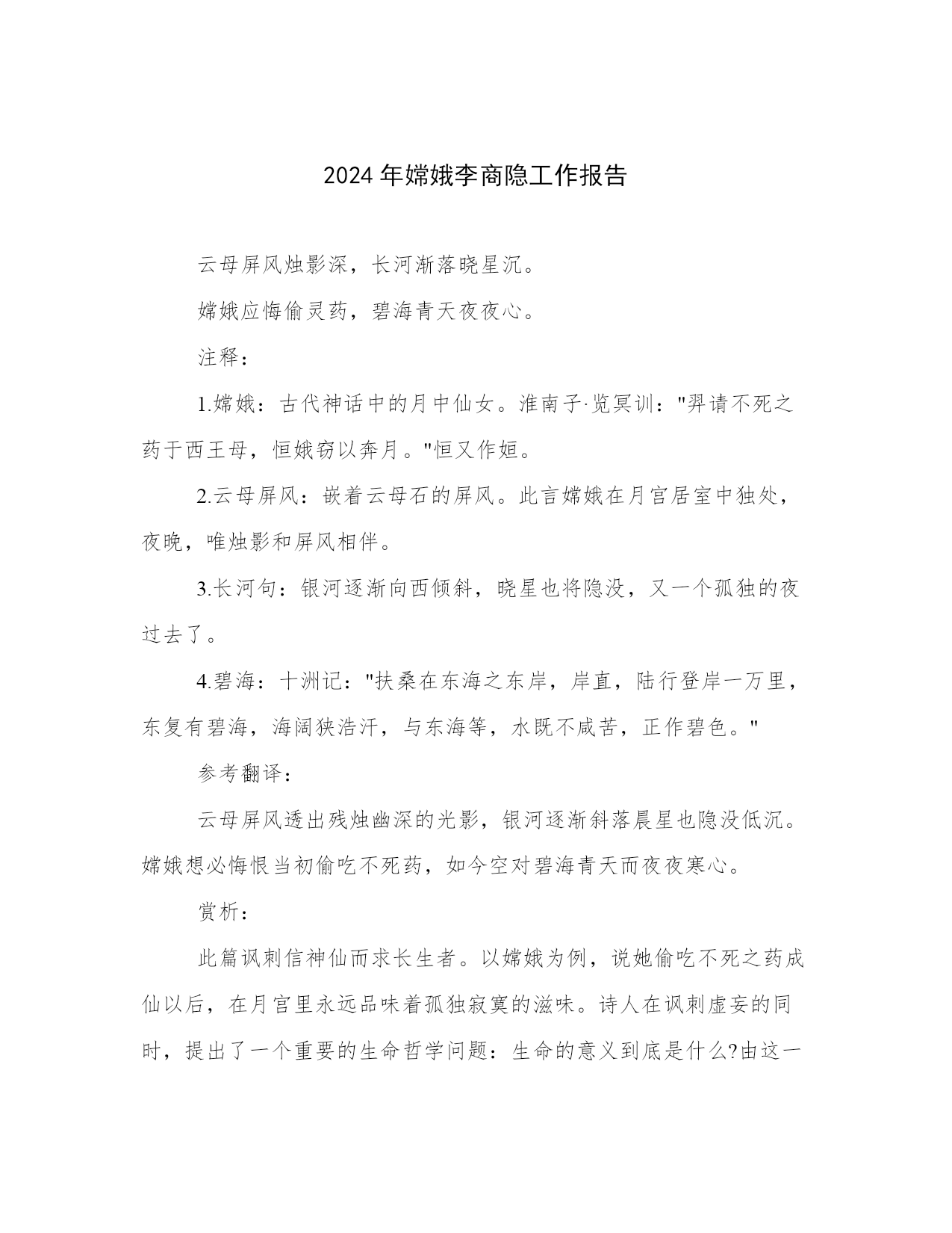 2024年嫦娥李商隐工作报告云母屏风烛影深,长河渐落晓星沉。嫦娥应悔偷灵药,碧海青天夜夜心。注释:1.嫦娥:古代神话中的月中仙女。淮南子·览冥训:"羿请不死之药于西王母,恒娥窃以奔月。"恒又作姮。2.云母屏风:嵌着云母石的屏风。此言嫦娥在月宫居室中独处,夜晚,唯烛影和屏风相伴。3.长河句:银河逐渐向西倾斜,晓星也将隐没,又一个孤独的夜过去了。4.碧海:十洲记:"扶桑在东海之东岸,岸直,陆行登岸一万里,东复有碧海,海阔狭浩汗,与东海等,水既不咸苦,正作碧色。"参考翻译:云母屏风透出残烛幽深的光影,银河逐渐斜