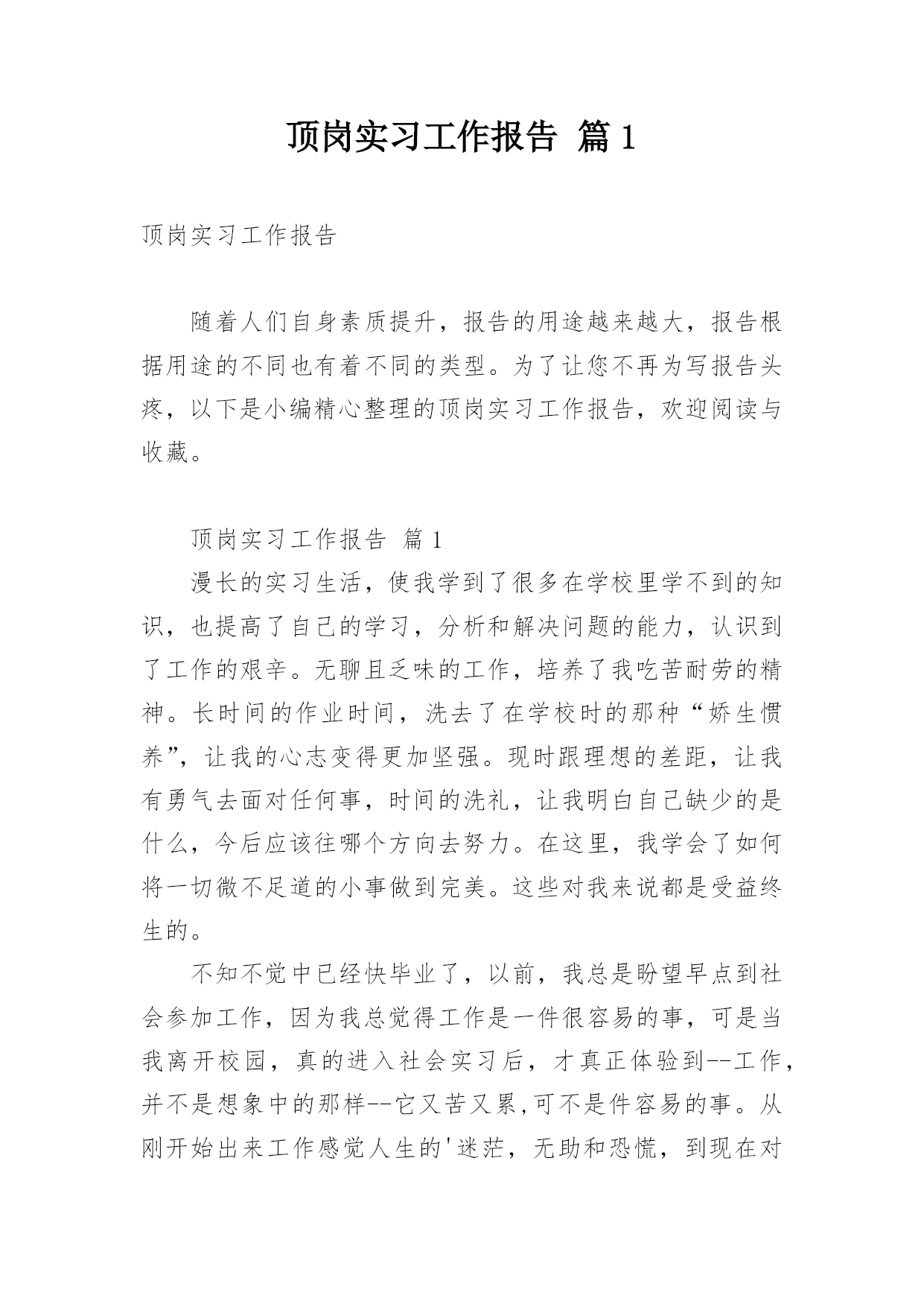 顶岗实习工作报告篇1顶岗实习工作报告随着人们自身素质提升,报告的用途越来越大,报告根据用途的不同也有着不同的类型。为了让您不再为写报告头疼,以下是小编精心整理的顶岗实习工作报告,欢迎阅读与收藏。顶岗实习工作报告篇1漫长的实习生活,使我学到了很多在学校里学不到的知识,也提高了自己的学习,分析和解决问题的能力,认识到了工作的艰辛。无聊且乏味的工作,培养了我吃苦耐劳的精神。长时间的作业时间,洗去了在学校时的那种“娇生惯养”,让我的心志变得更加坚强。现时跟理想的差距,让我有勇气去面对任何事,时间的洗礼,让我明白自