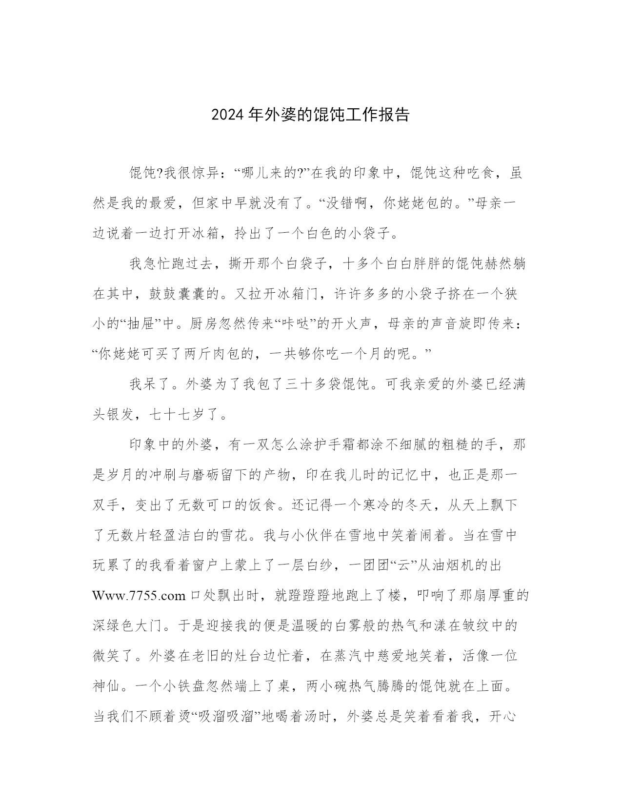 2024年外婆的馄饨工作报告馄饨?我很惊异:“哪儿来的?”在我的印象中,馄饨这种吃食,虽然是我的最爱,但家中早就没有了。“没错啊,你姥姥包的。”母亲一边说着一边打开冰箱,拎出了一个白色的小袋子。我急忙跑过去,撕开那个白袋子,十多个白白胖胖的馄饨赫然躺在其中,鼓鼓囊囊的。又拉开冰箱门,许许多多的小袋子挤在一个狭小的“抽屉”中。厨房忽然传来“咔哒”的开火声,母亲的声音旋即传来:“你姥姥可买了两斤肉包的,一共够你吃一个月的呢。”我呆了。外婆为了我包了三十多袋馄饨。可我亲爱的外婆已经满头银发,七十七岁了。印象中的