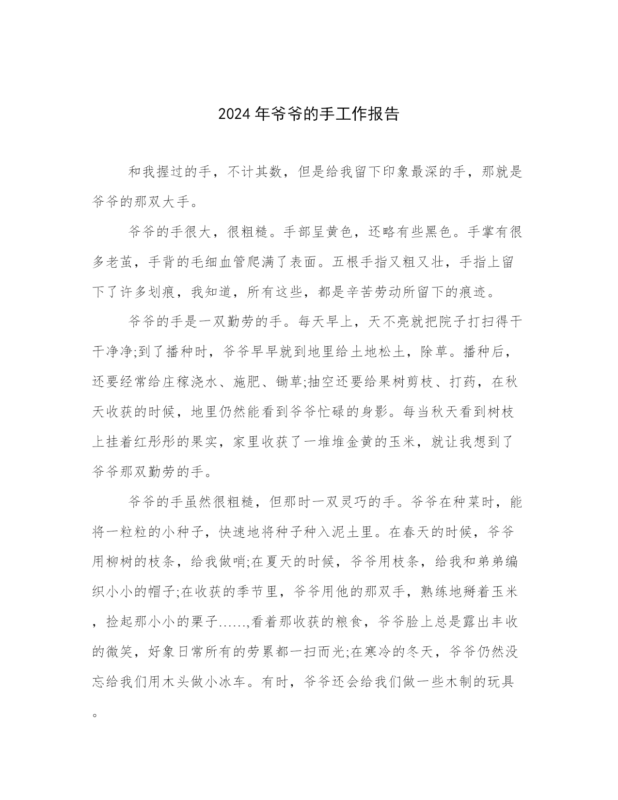 2024年爷爷的手工作报告和我握过的手,不计其数,但是给我留下印象最深的手,那就是爷爷的那双大手。爷爷的手很大,很粗糙。手部呈黄色,还略有些黑色。手掌有很多老茧,手背的毛细血管爬满了表面。五根手指又粗又壮,手指上留下了许多划痕,我知道,所有这些,都是辛苦劳动所留下的痕迹。爷爷的手是一双勤劳的手。每天早上,天不亮就把院子打扫得干干净净;到了播种时,爷爷早早就到地里给土地松土,除草。播种后,还要经常给庄稼浇水、施肥、锄草;抽空还要给果树剪枝、打药,在秋天收获的时候,地里仍然能看到爷爷忙碌的身影。每当秋天看到树