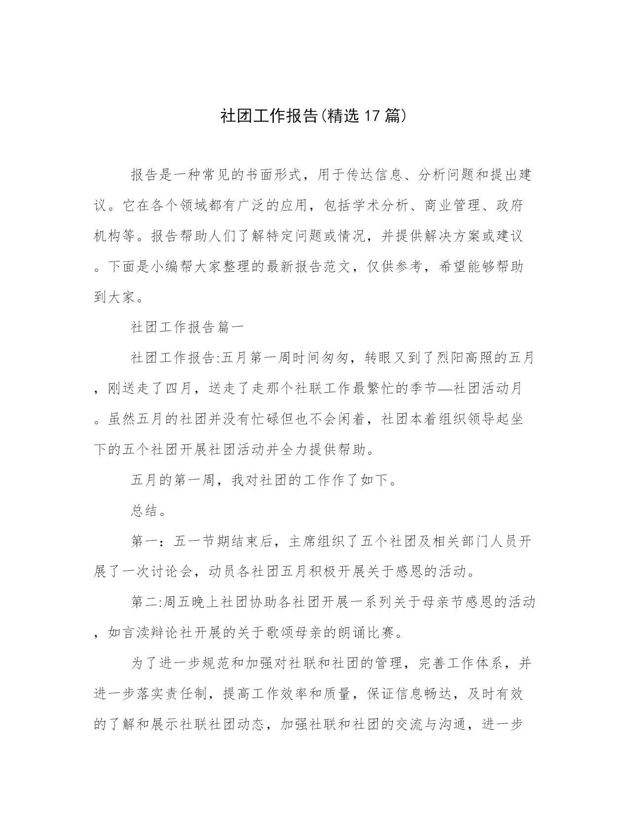 社团工作报告(精选17篇)报告是一种常见的书面形式,用于传达信息、分析问题和提出建议。它在各个领域都有广泛的应用,包括学术分析、商业管理、政府机构等。报告帮助人们了解特定问题或情况,并提供解决方案或建议。下面是小编帮大家整理的最新报告范文,仅供参考,希望能够帮助到大家。社团工作报告篇一社团工作报告:五月第一周时间匆匆,转眼又到了烈阳高照的五月,刚送走了四月,送走了走那个社联工作最繁忙的季节—社团活动月。虽然五月的社团并没有忙碌但也不会闲着,社团本着组织领导起坐下的五个社团开展社团活动并全力提供帮助。五月的