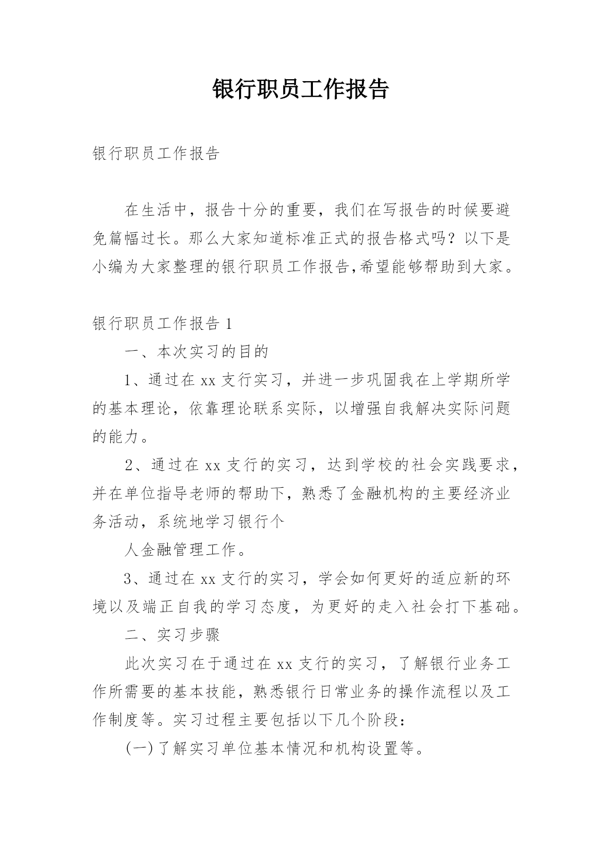 银行职员工作报告银行职员工作报告在生活中,报告十分的重要,我们在写报告的时候要避免篇幅过长。那么大家知道标准正式的报告格式吗?以下是小编为大家整理的银行职员工作报告,希望能够帮助到大家。银行职员工作报告1一、本次实习的目的1、通过在xx支行实习,并进一步巩固我在上学期所学的基本理论,依靠理论联系实际,以增强自我解决实际问题的能力。2、通过在xx支行的实习,达到学校的社会实践要求,并在单位指导老师的帮助下,熟悉了金融机构的主要经济业务活动,系统地学习银行个人金融管理工作。3、通过在xx支行的实习,学会如何更