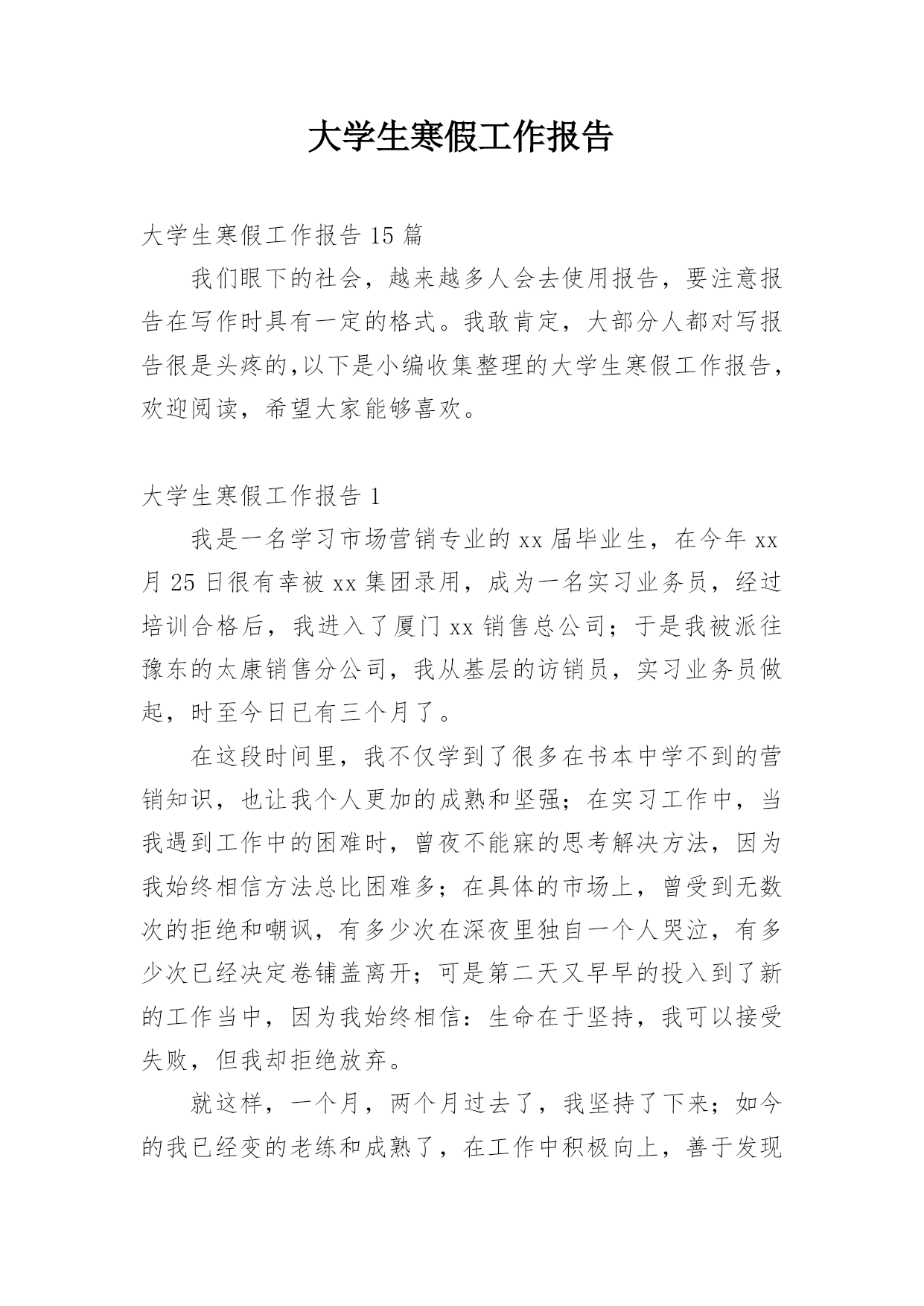 大学生寒假工作报告大学生寒假工作报告15篇我们眼下的社会,越来越多人会去使用报告,要注意报告在写作时具有一定的格式。我敢肯定,大部分人都对写报告很是头疼的,以下是小编收集整理的大学生寒假工作报告,欢迎阅读,希望大家能够喜欢。大学生寒假工作报告1我是一名学习市场营销专业的xx届毕业生,在今年xx月25日很有幸被xx集团录用,成为一名实习业务员,经过培训合格后,我进入了厦门xx销售总公司;于是我被派往豫东的太康销售分公司,我从基层的访销员,实习业务员做起,时至今日已有三个月了。在这段时间里,我不仅学到了很多在