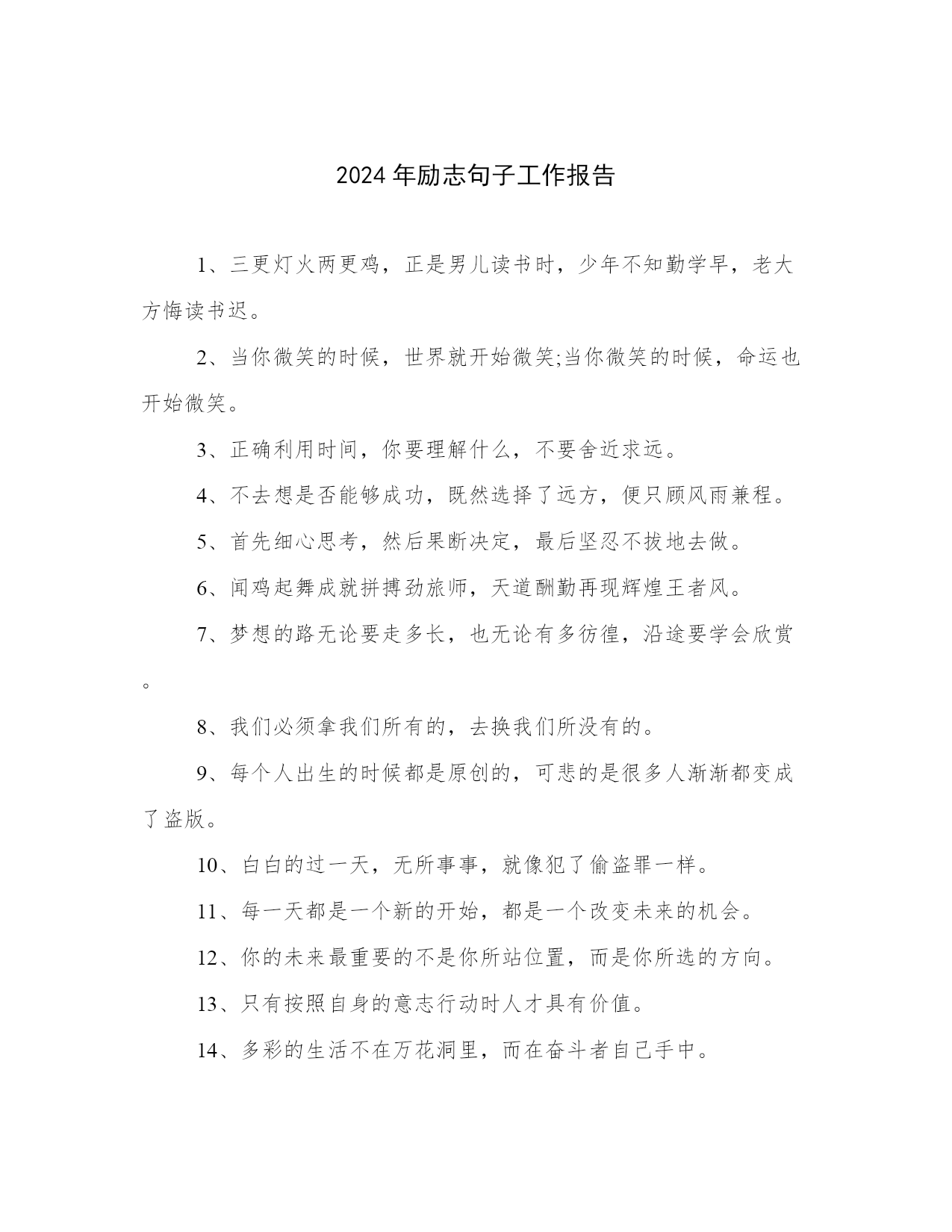 2024年励志句子工作报告1、三更灯火两更鸡,正是男儿读书时,少年不知勤学早,老大方悔读书迟。2、当你微笑的时候,世界就开始微笑;当你微笑的时候,命运也开始微笑。3、正确利用时间,你要理解什么,不要舍近求远。4、不去想是否能够成功,既然选择了远方,便只顾风雨兼程。5、首先细心思考,然后果断决定,最后坚忍不拔地去做。6、闻鸡起舞成就拼搏劲旅师,天道酬勤再现辉煌王者风。7、梦想的路无论要走多长,也无论有多彷徨,沿途要学会欣赏。8、我们必须拿我们所有的,去换我们所没有的。9、每个人出生的时候都是原创的,可悲的是